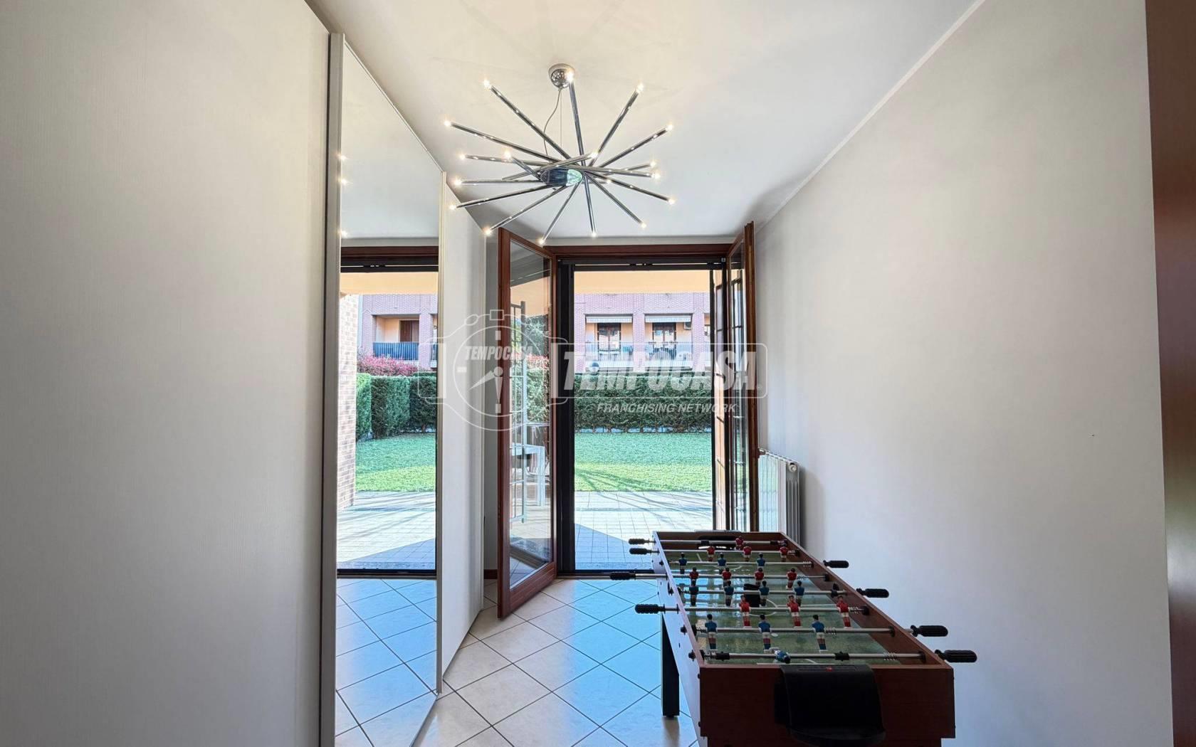 Tra gli elementi che rendono questa soluzione particolarmente interessante spiccano il piano terra, che elimina barriere e facilita ogni spostamento, il giardino privato che rappresenta un vero sfogo esterno esclusivo, valorizzato dalla presenza dell’impianto di irrigazione, e il portico che rende gli spazi ancora più vivibili in ogni stagione. L’appartamento è inoltre dotato di antifurto, grate di sicurezza e zanzariere, elementi che aumentano il livello di protezione e comfort nella vita quotidiana. A completare la proprietà troviamo una cantina e un box doppio di circa 31 mq raggiungibile tramite ascensore ideale per ospitare comodamente due auto e offrire ulteriore spazio di deposito.