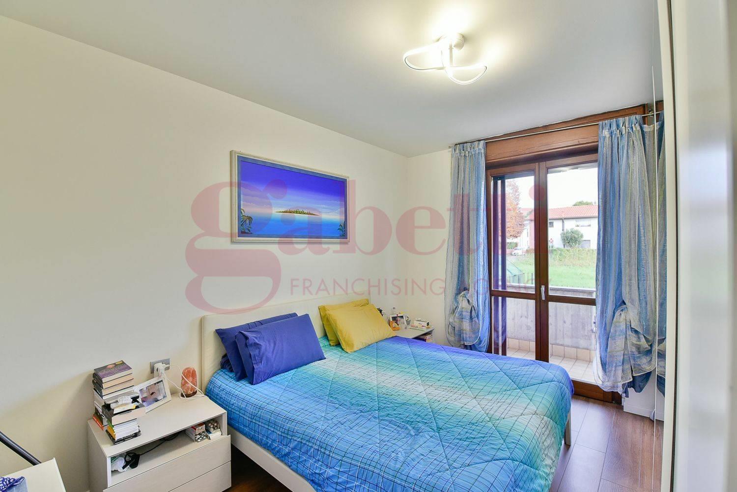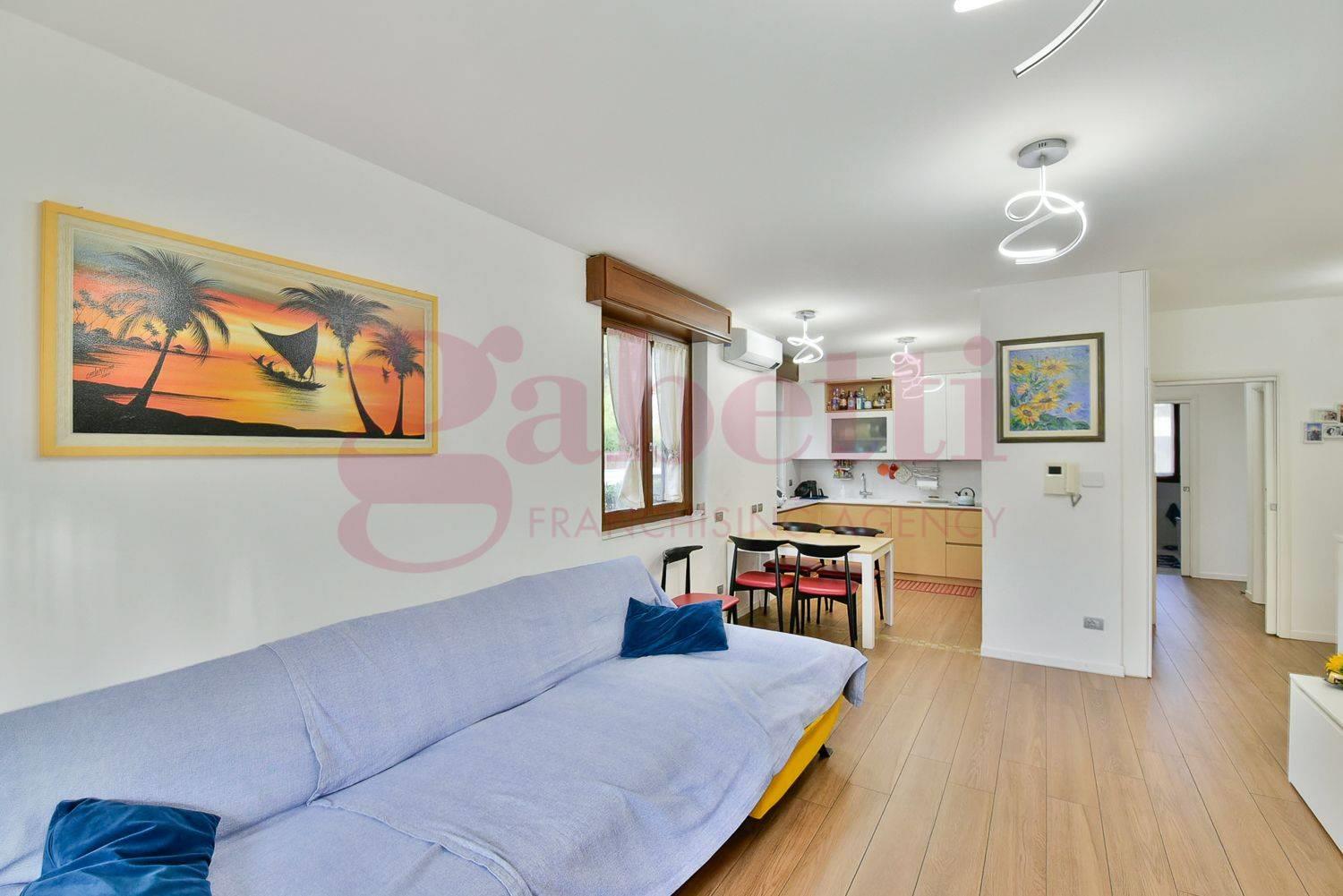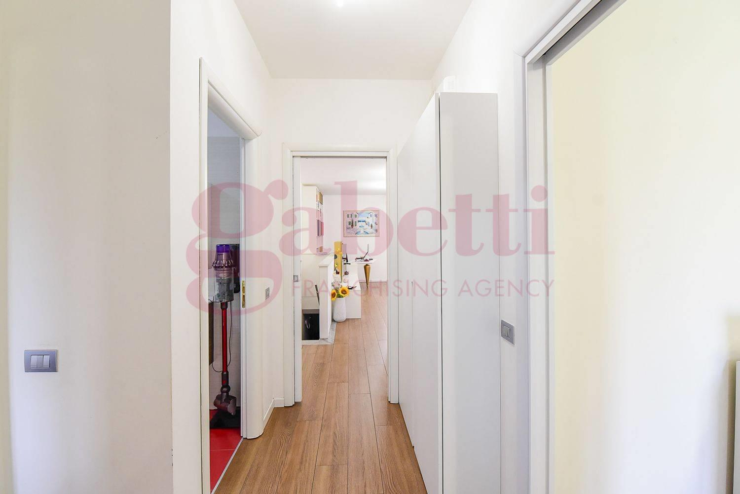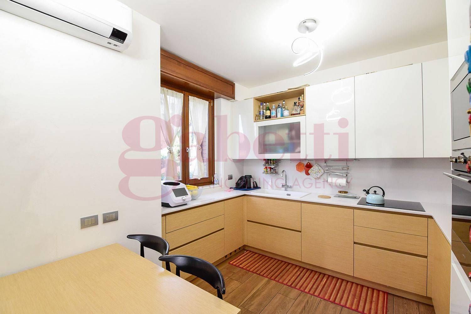 L’abitazione gode di ingresso indipendente dal giardino ed è composta da un ampio soggiorno con cucina a vista con affaccio su un terrazzino, disimpegno, due camere da letto di cui una con balcone e doppi servizi finestrati.
