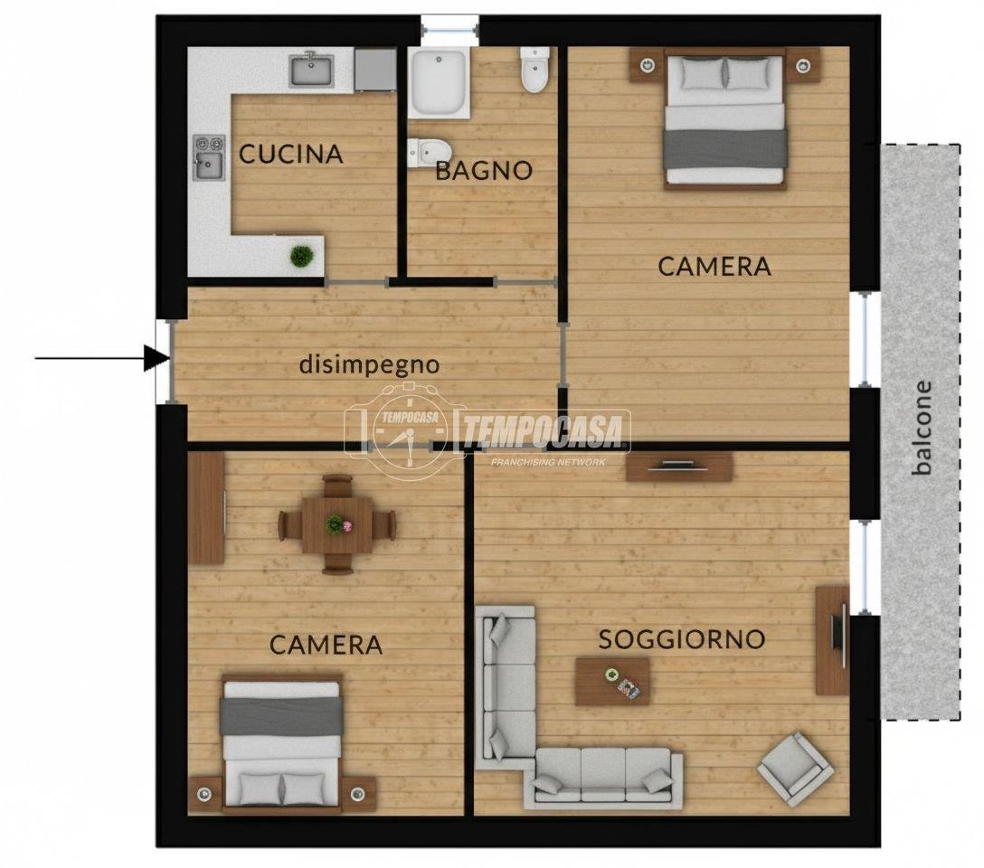Gli interni offrono ambienti ampi e ben distribuiti, pensati per una vita domestica confortevole. L’ingresso conduce alla cucina abitabile, perfetta per pranzi e momenti conviviali, mentre il soggiorno diventa uno spazio accogliente per il relax. Le due camere matrimoniali assicurano privacy e comodità, e l’accesso al balcone sia dal soggiorno che dalla camera regala uno sfogo esterno ideale per pause all’aperto. Il bagno completa una disposizione pratica e funzionale.