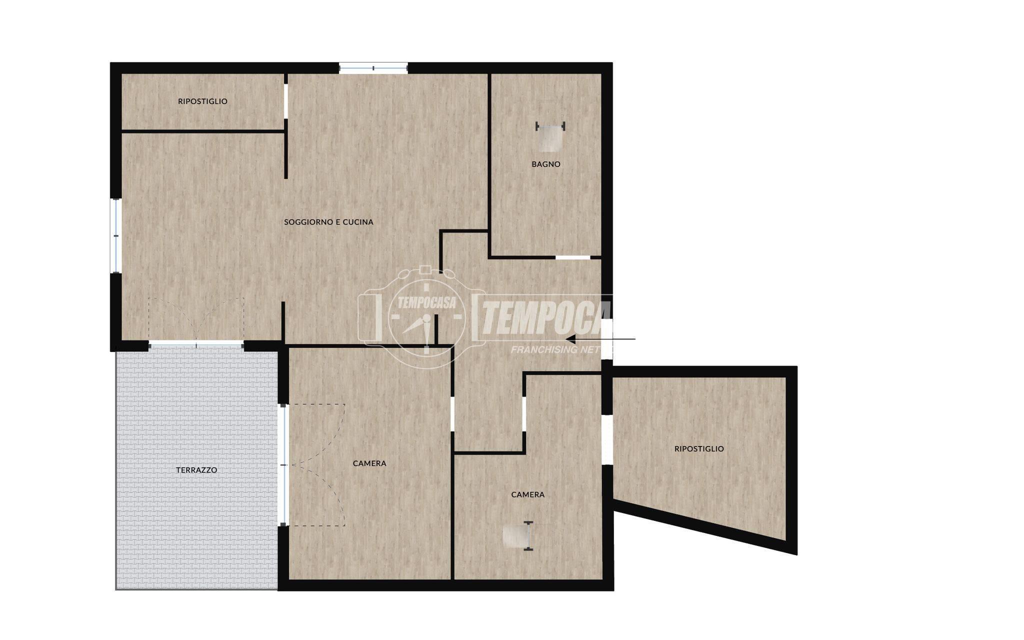Il soggiorno, caratterizzato da un CAMINO, con cucina a vista crea un ambiente accogliente e funzionale, accompagnato da un comodo ripostiglio interno.