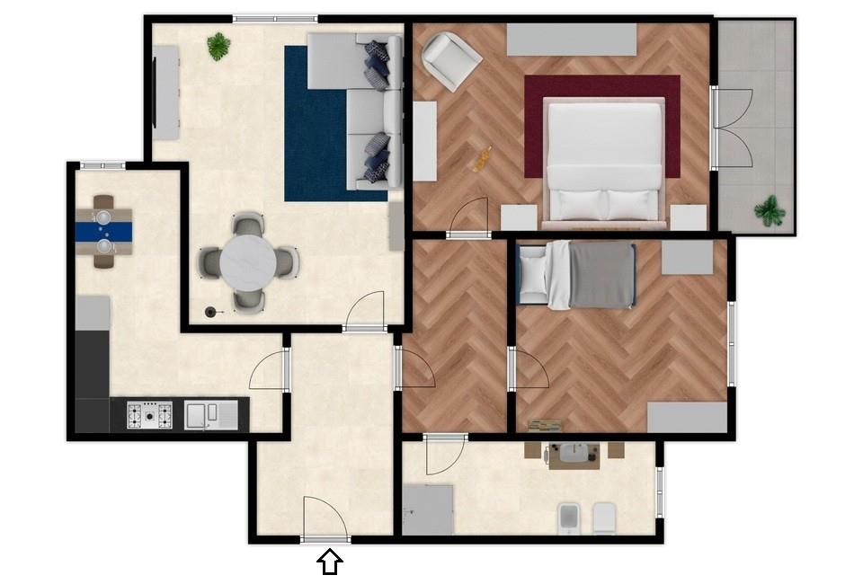 L’ingresso, ampio e accogliente, conduce alla zona giorno composta dal soggiorno e una cucina abitabile. La zona notte, ben separata per garantire privacy e tranquillità, offre due camere da letto, un bagno finestrato e due balconi. Completano la proprietà una comoda cantina inclusa nel prezzo.