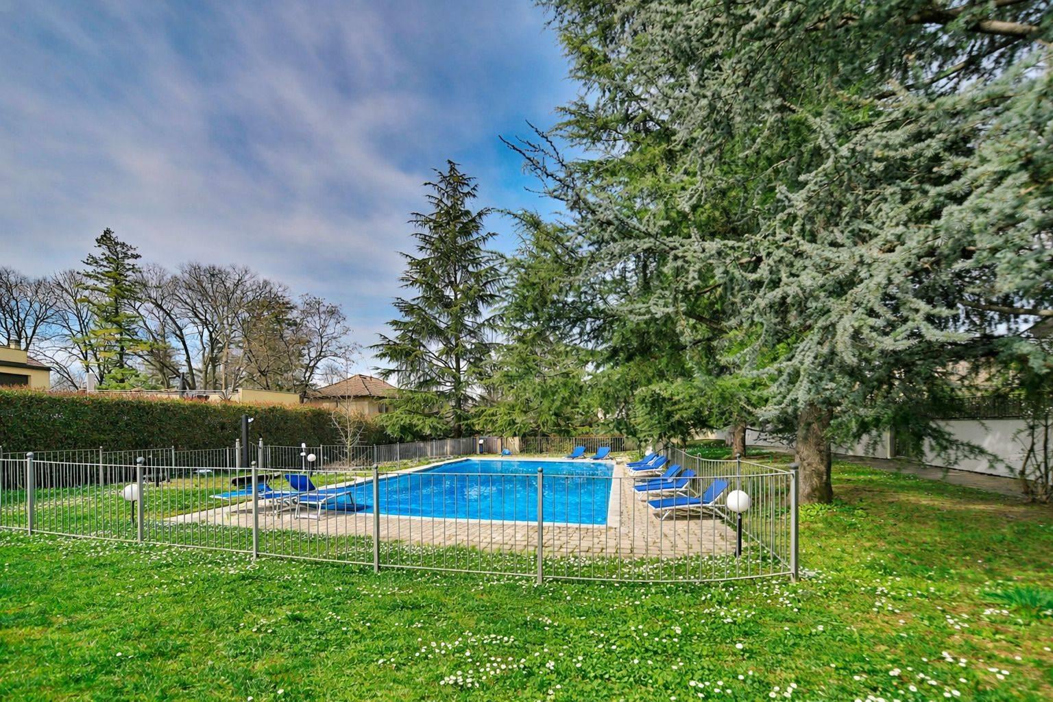 Il complesso, caratterizzato da poche unità abitative, conserva il fascino dell’architettura d’epoca e offre ai residenti il privilegio di vivere circondati da un ampio parco condominiale, impreziosito da piscina ad uso esclusivo dei condomini, ideale per momenti di relax e convivialità immersi nel verde.