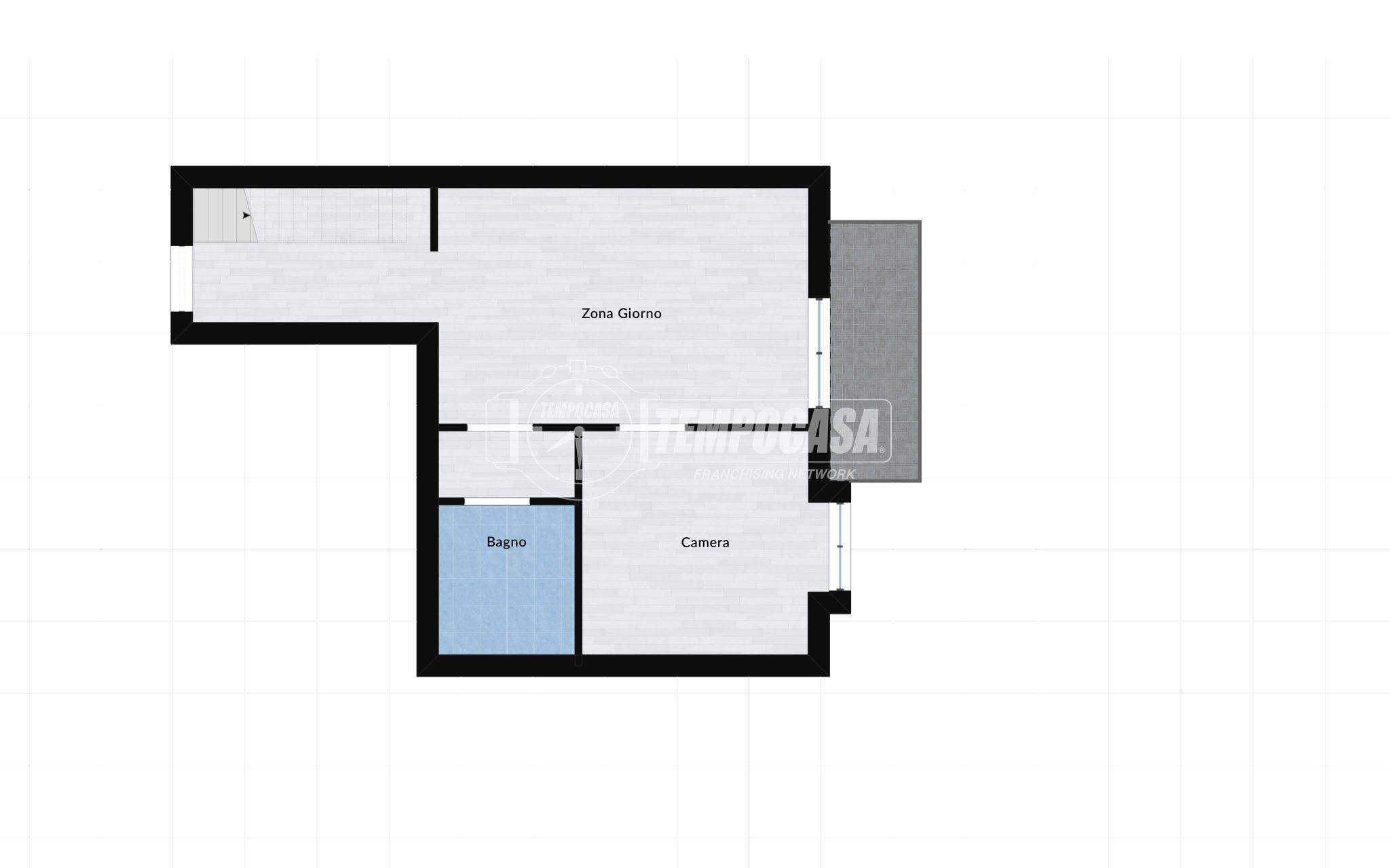 Al piano principale si trova una luminosa zona giorno con soggiorno e cucina a vista, con accesso diretto al balcone, ideale per momenti di relax all’aperto. Completano il livello una camera da letto e un bagno.