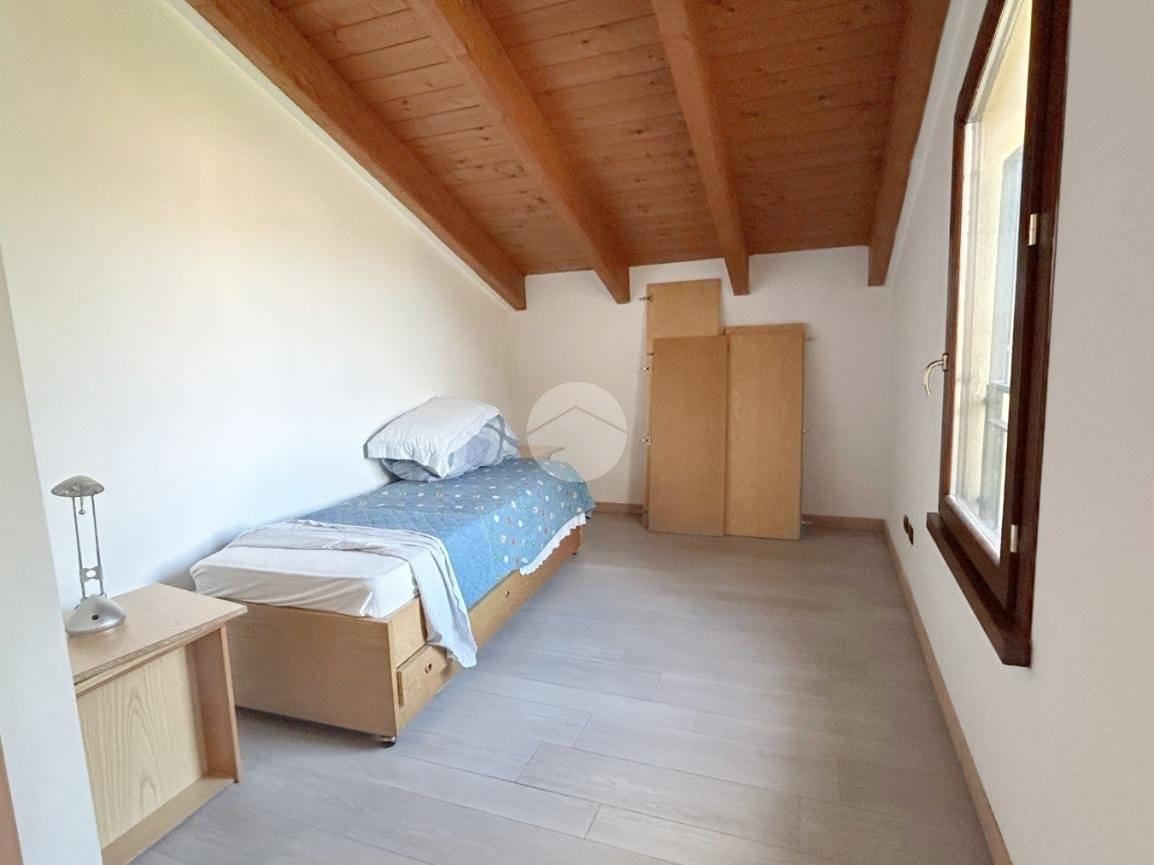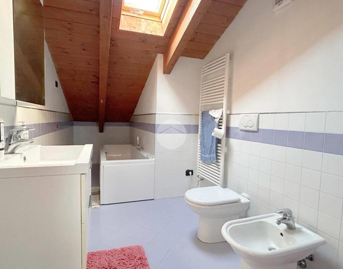 Al piano superiore tre ampi locali tutti finestrati e caratterizzati da travi a vista e un altro servizio con doccia e vasca al piano.