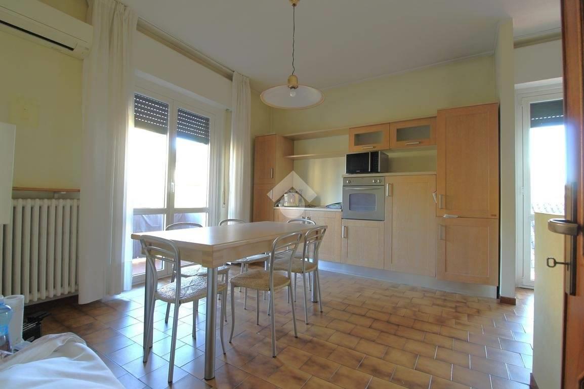 L’ingresso indipendente conduce all’abitazione composta da un ampio e luminoso soggiorno con balcone, ben organizzato tra zona pranzo e zona salotto. La cucina è abitabile, di generose dimensioni e anch’essa servita da balcone.