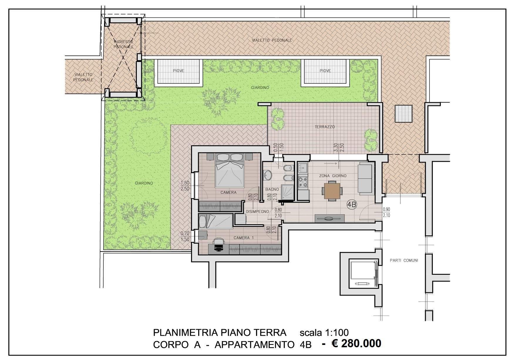 Proponiamo al piano terreno, 3 locali con giardino privato di 85 mq c. A e cantina.