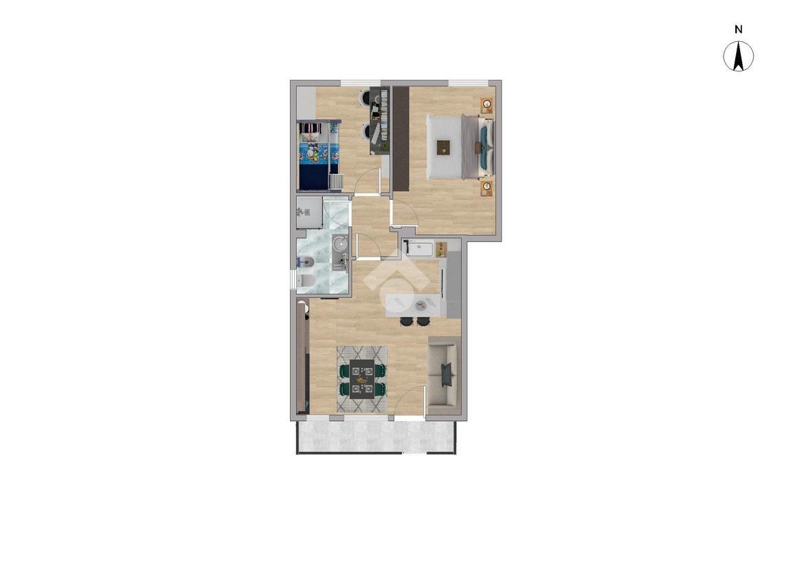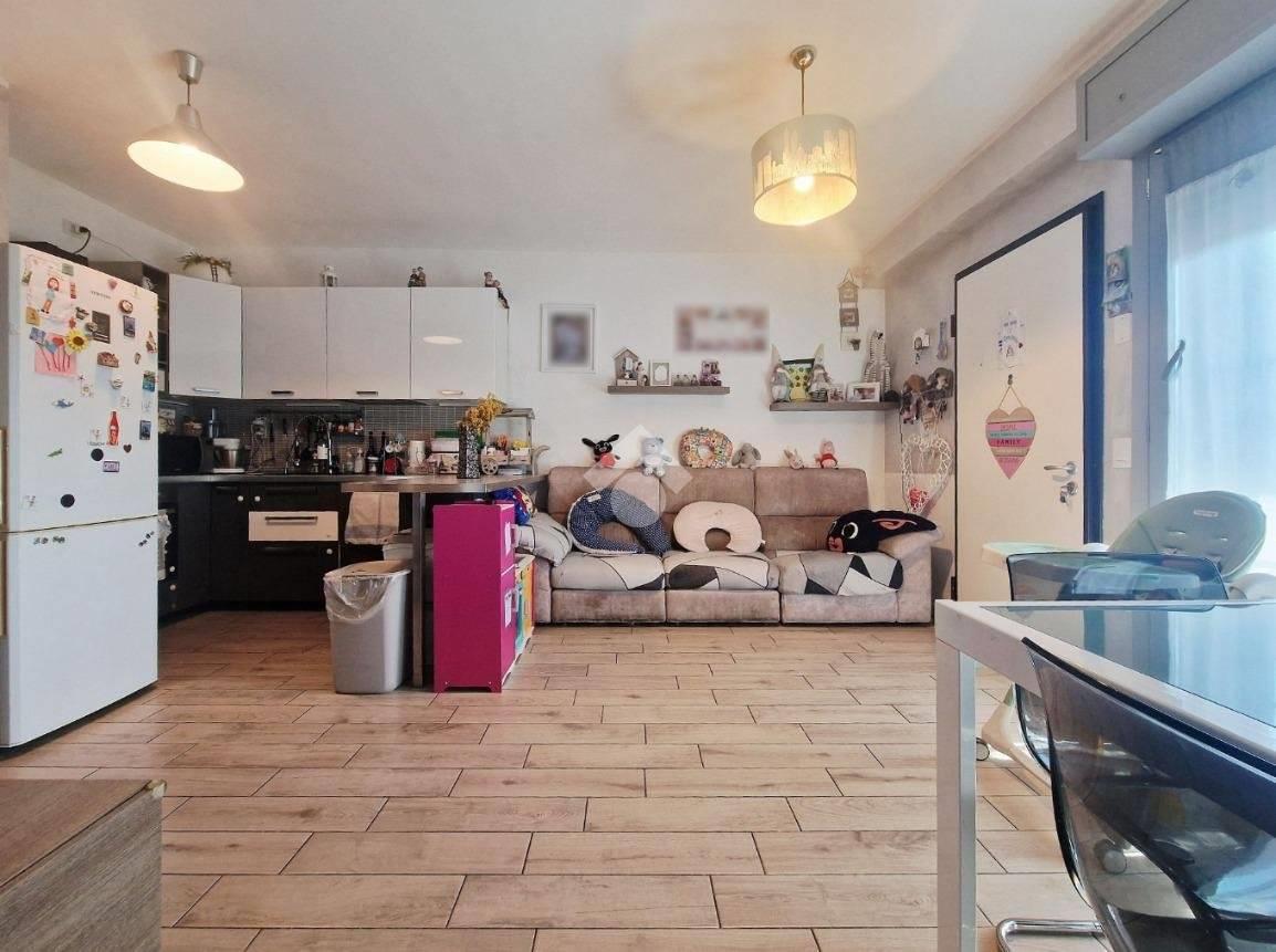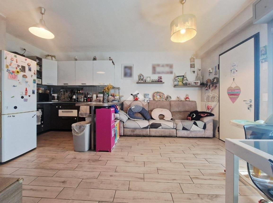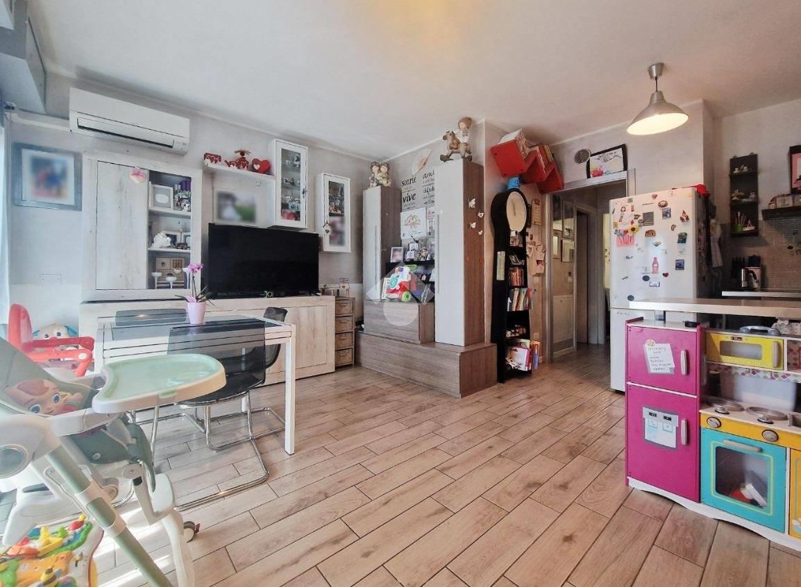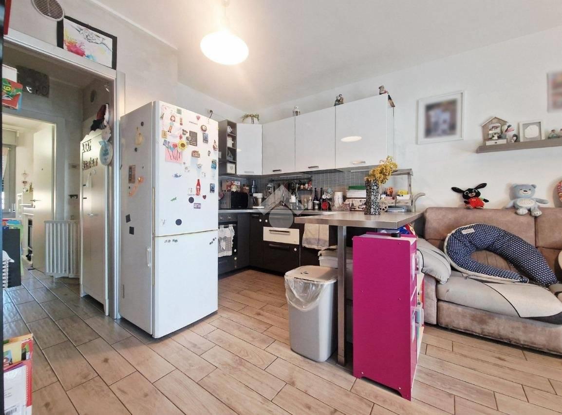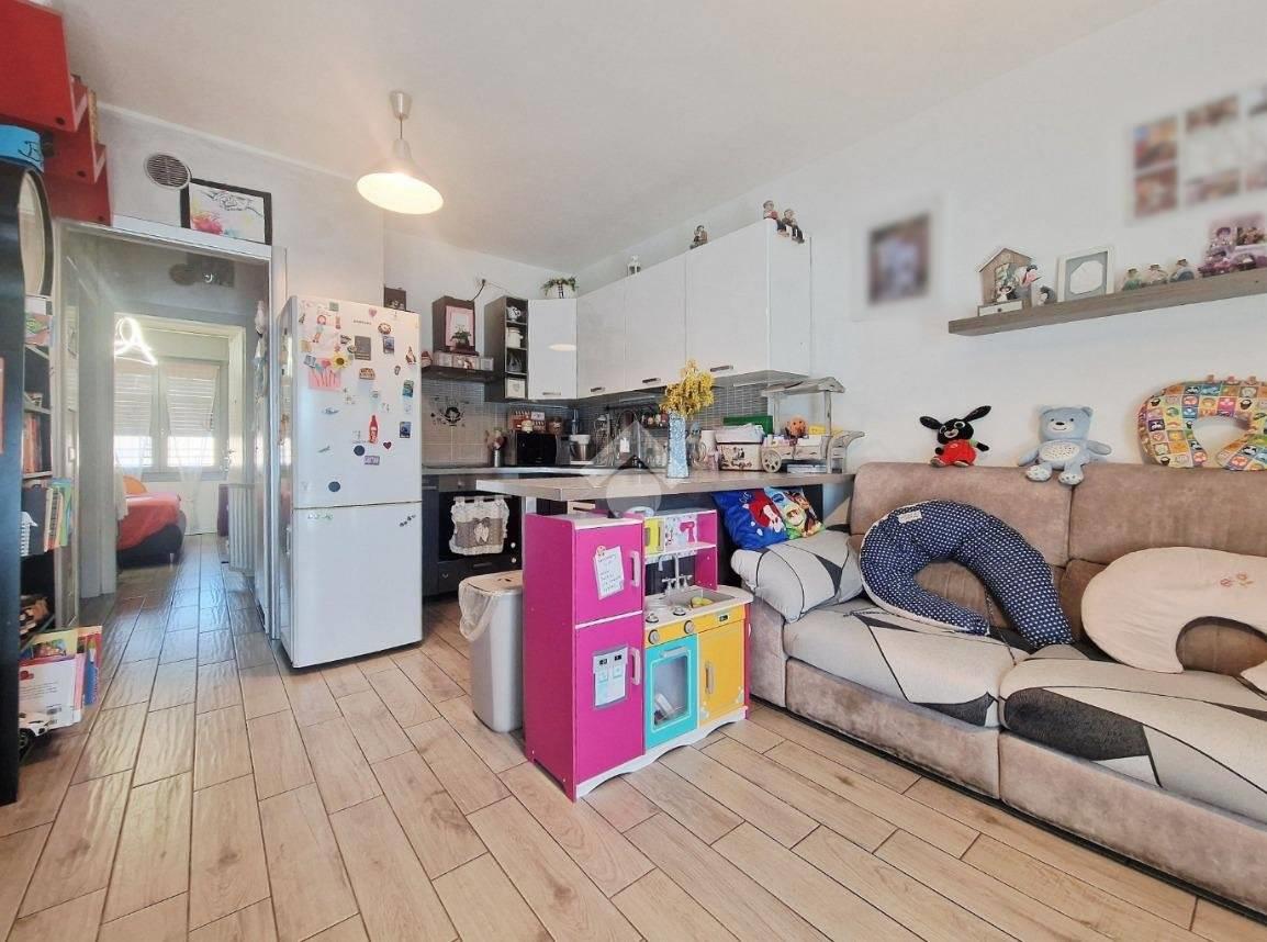 L'ingresso è sulla zona giorno con cucina a vista mentre il disimpegno conduce al bagno finestrato e alle due camere da letto.