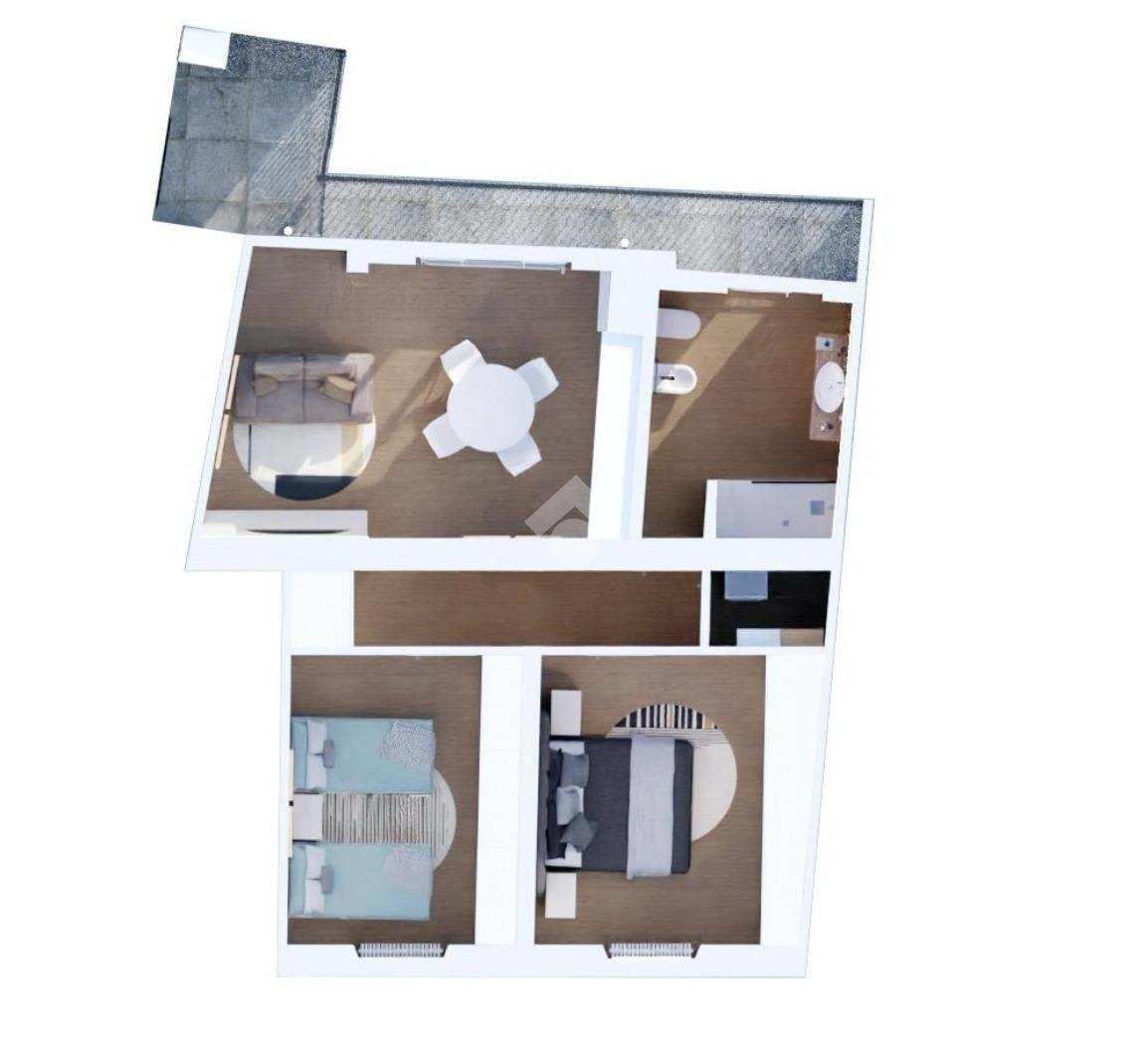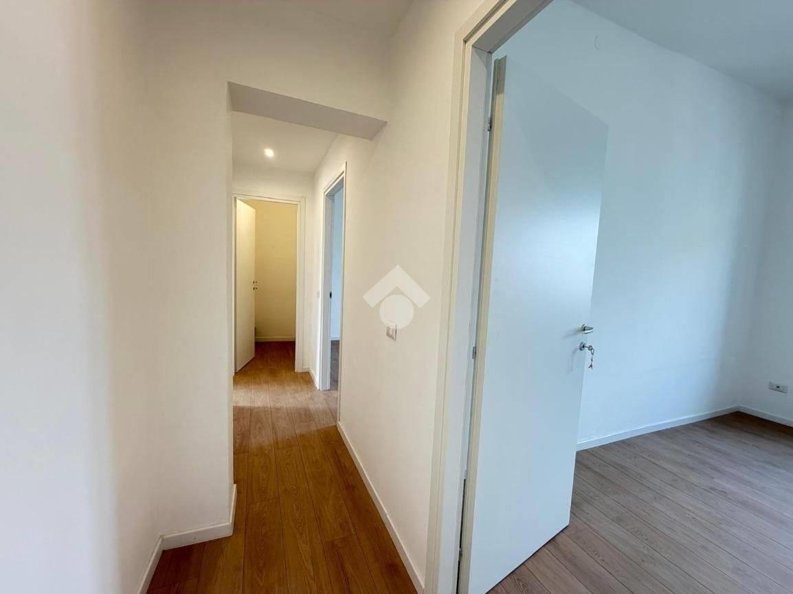 La soluzione si compone di un accogliente soggiorno con angolo cottura, due spaziose camere da letto, un pratico ripostiglio predisposto con attacchi per lavatrice e un moderno bagno finestrato, completo di doccia walk-in.