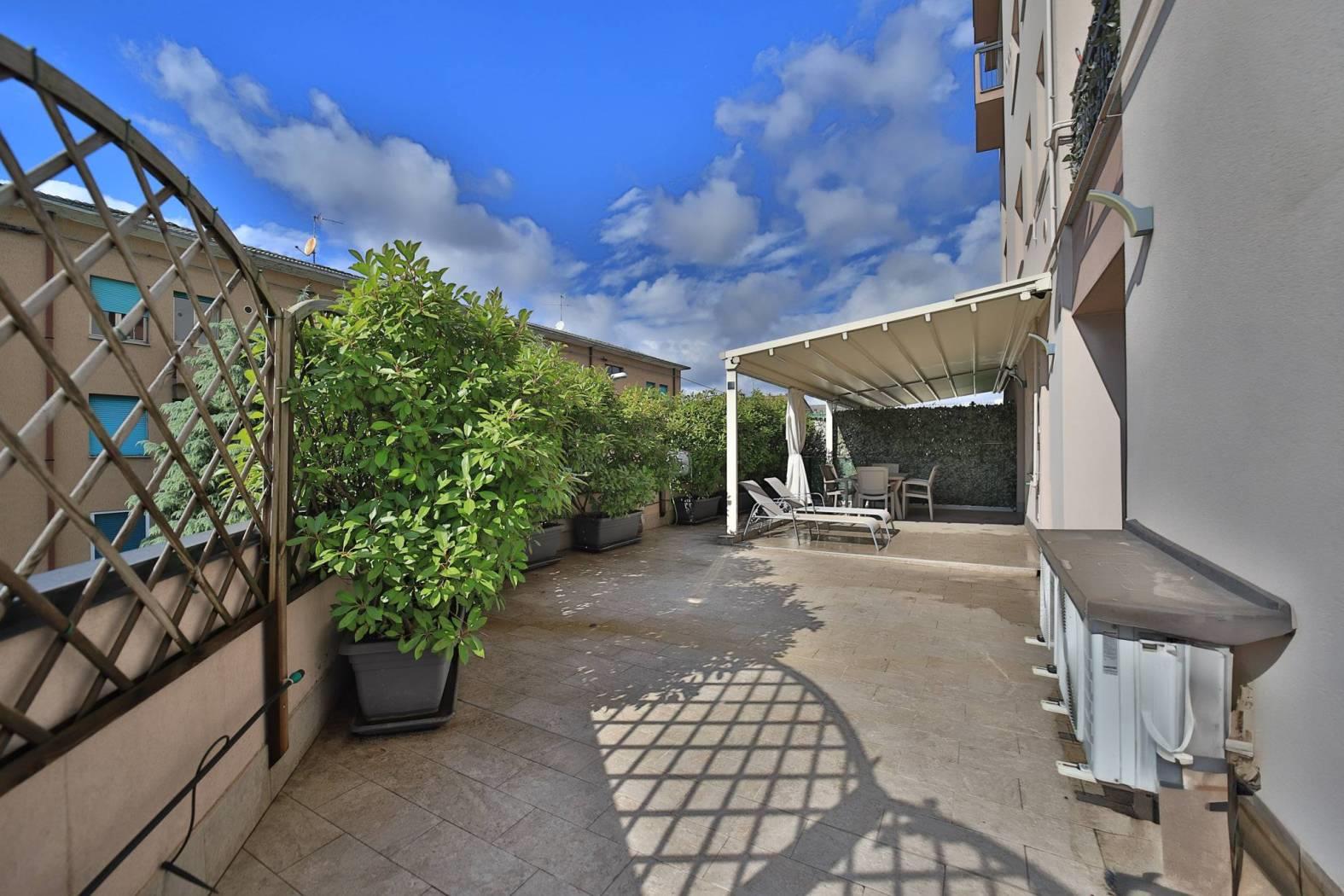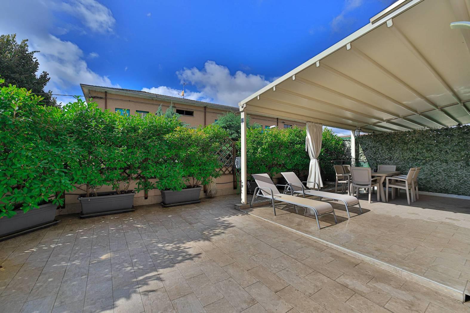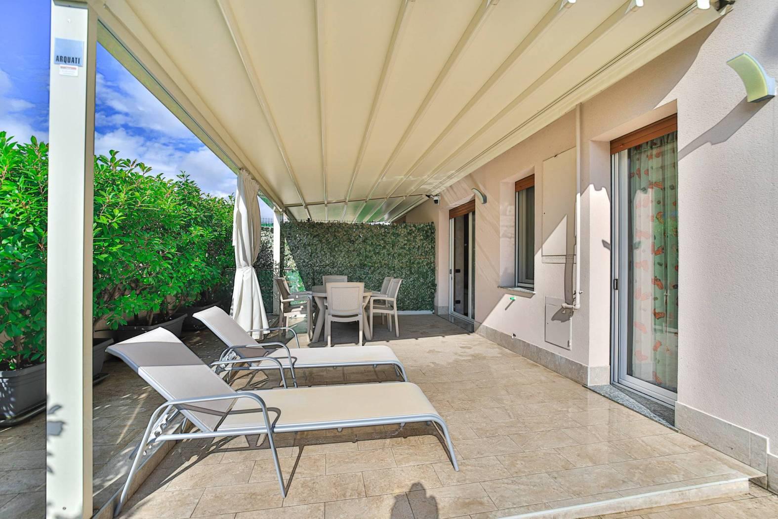 Il soggiorno con cucina a vista, ampio e luminoso, è valorizzato da una finestratura scorrevole che si affaccia a tutta parete su un incantevole terrazzo di 56,00 mq. Qui potrai rilassarti e organizzare pranzi e cene all'aperto grazie alla Pergo Tenda motorizzata, che offre riparo dal sole e dalla pioggia, mentre la parte aperta è perfetta per prendere il sole o grigliare in totale privacy, garantita da una siepe ben curata.