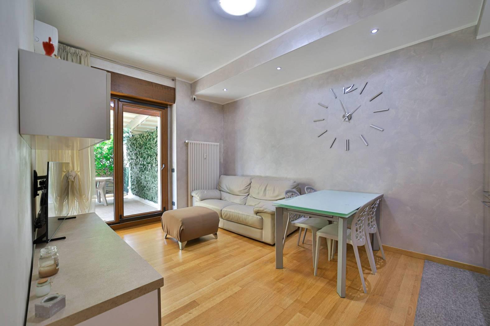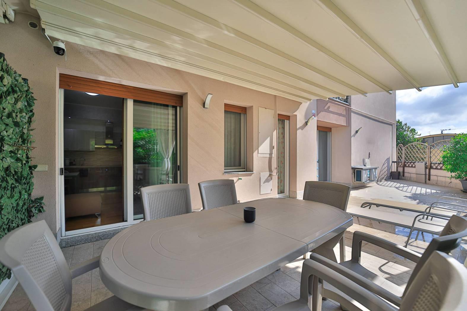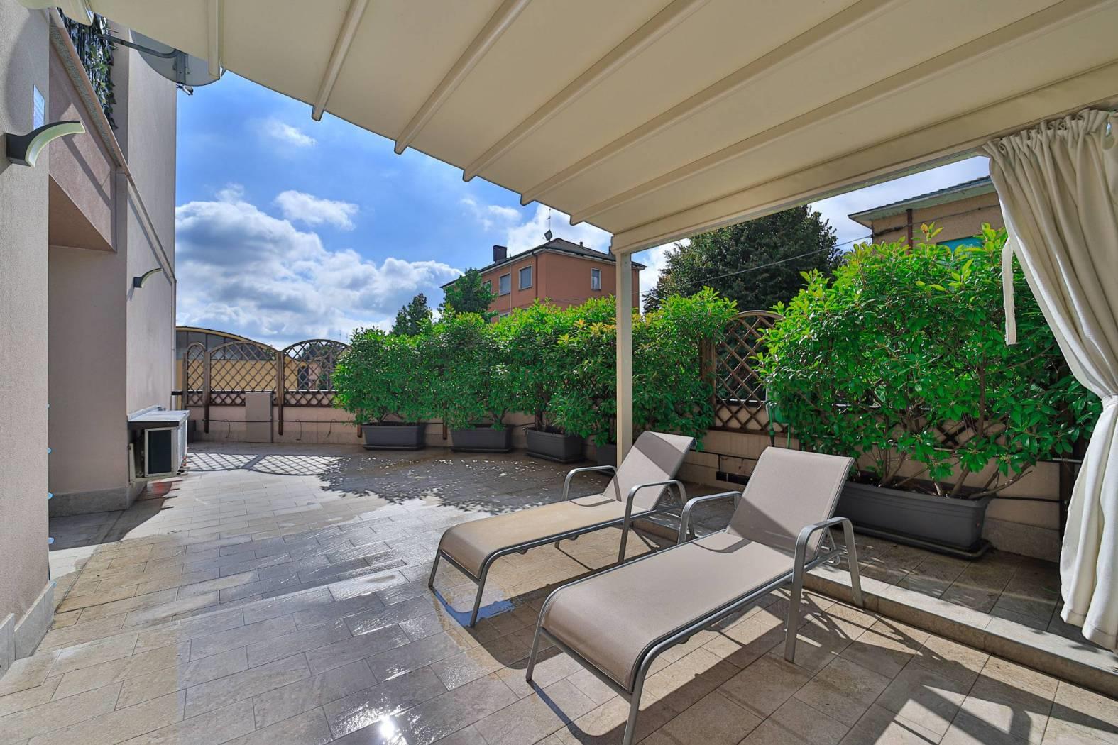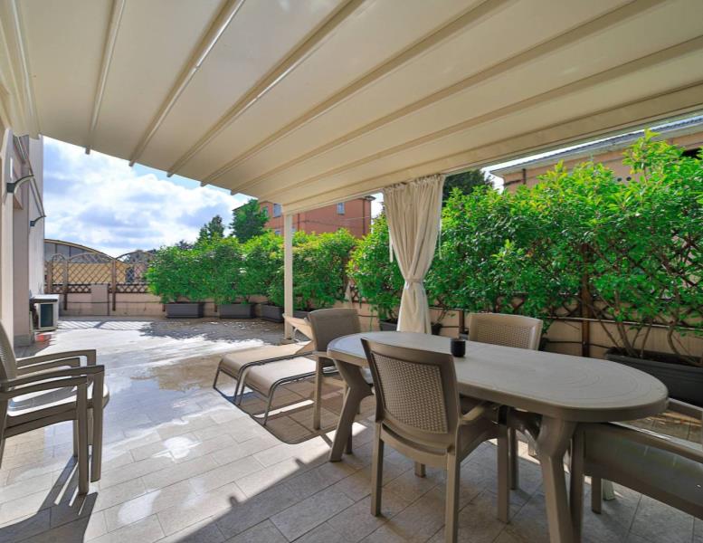 Il soggiorno con cucina a vista, ampio e luminoso, è valorizzato da una finestratura scorrevole che si affaccia a tutta parete su un incantevole terrazzo di 56,00 mq. Qui potrai rilassarti e organizzare pranzi e cene all'aperto grazie alla Pergo Tenda motorizzata, che offre riparo dal sole e dalla pioggia, mentre la parte aperta è perfetta per prendere il sole o grigliare in totale privacy, garantita da una siepe ben curata.