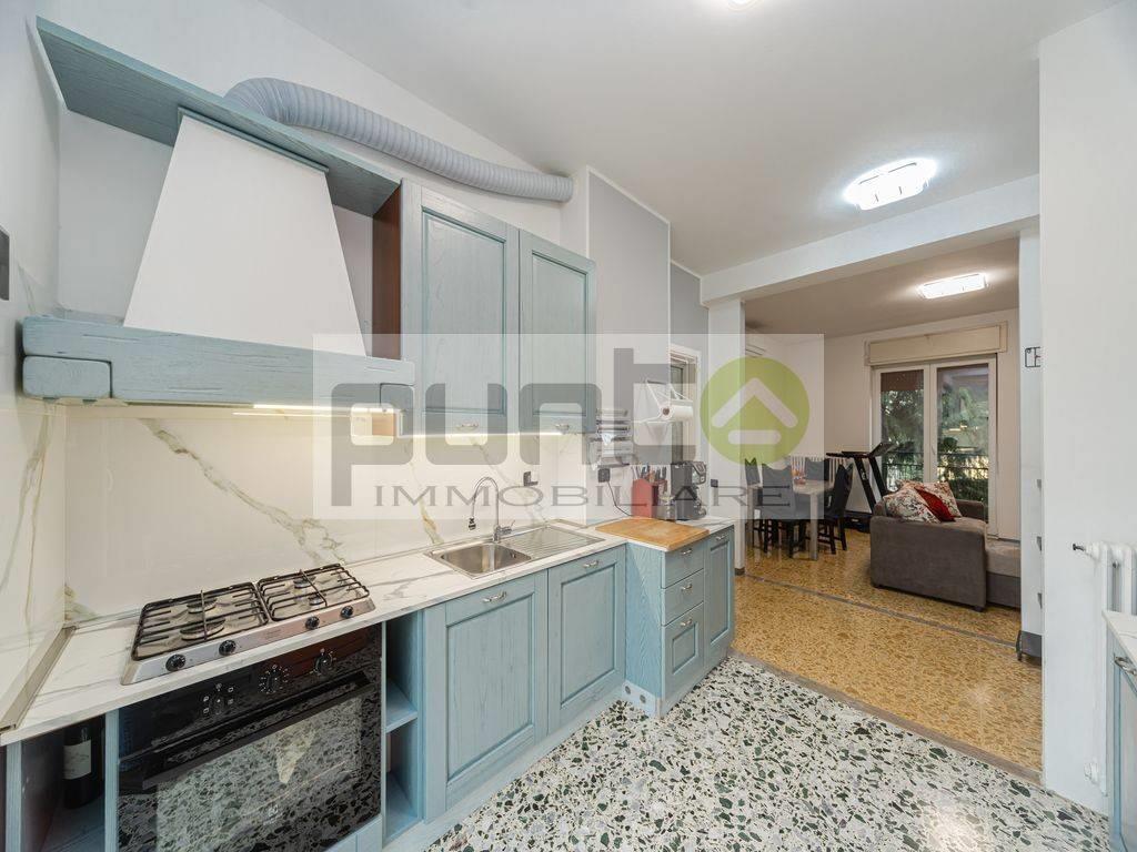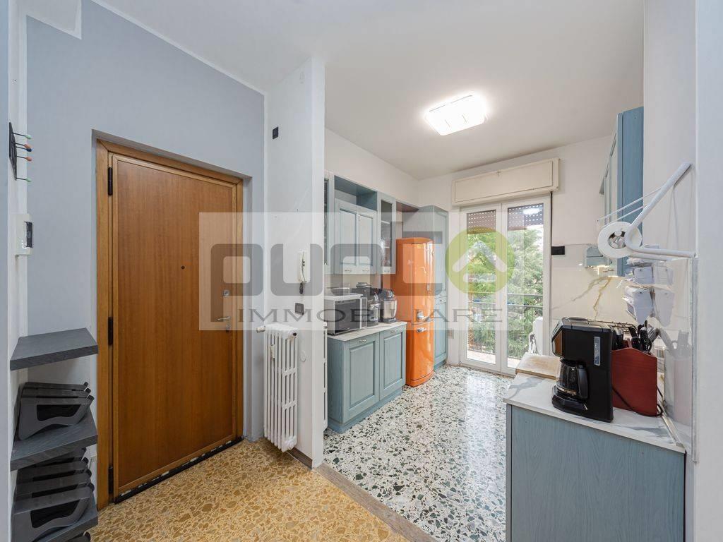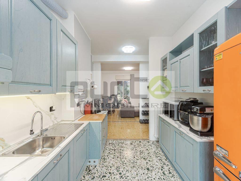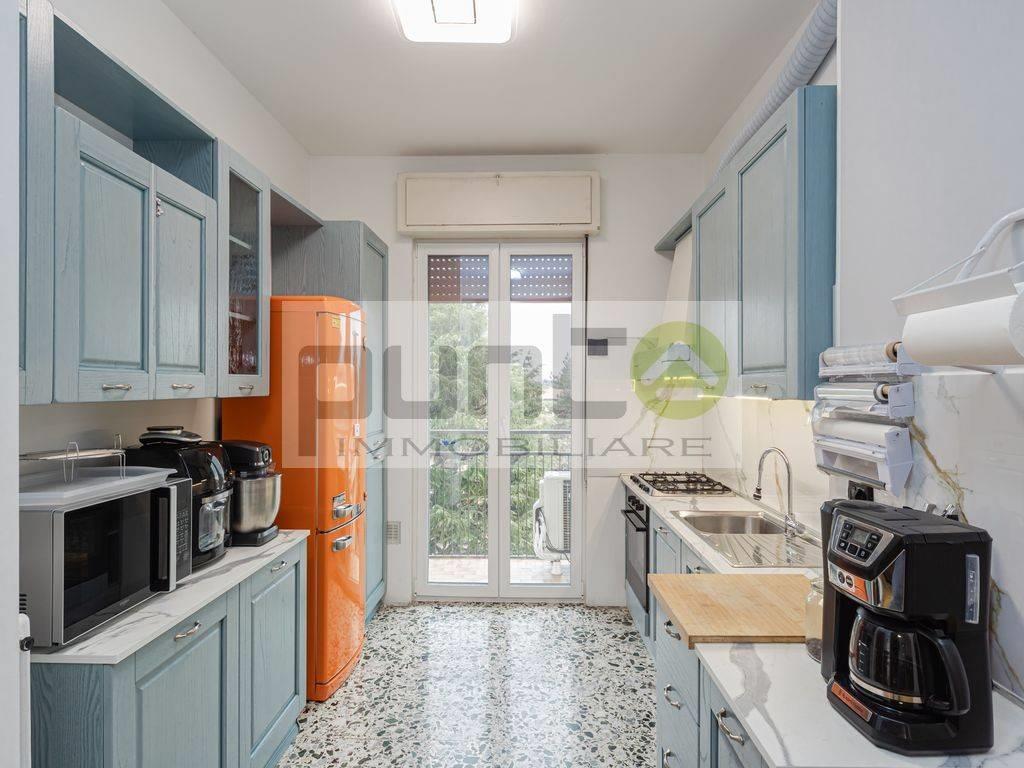 La disposizione offre una funzionale zona giorno con cucina, entrambe dotate di balcone, un bagno finestrato e due camere da letto di generose dimensioni. La doppia esposizione garantisce ottima luminosità e un piacevole affaccio sia interno che esterno.