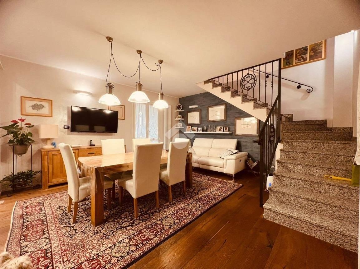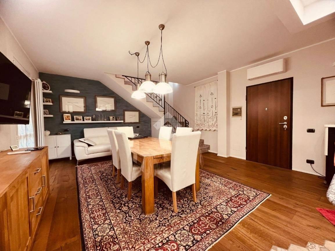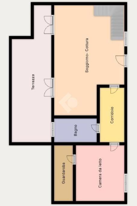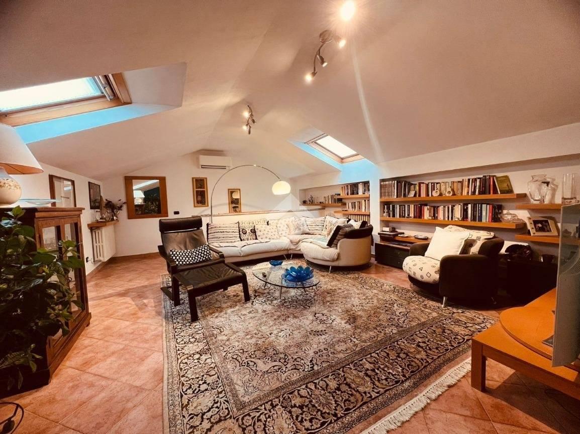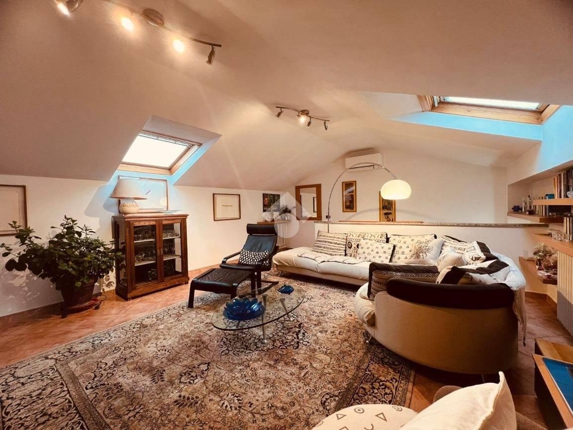 La scala in muratura conduce al piano superiore mansardato (agibile ma non abitabile), attualmente organizzato con un secondo soggiorno, una camera/studio e un servizio finestrato con doccia