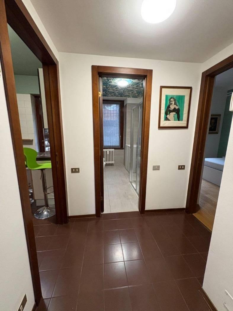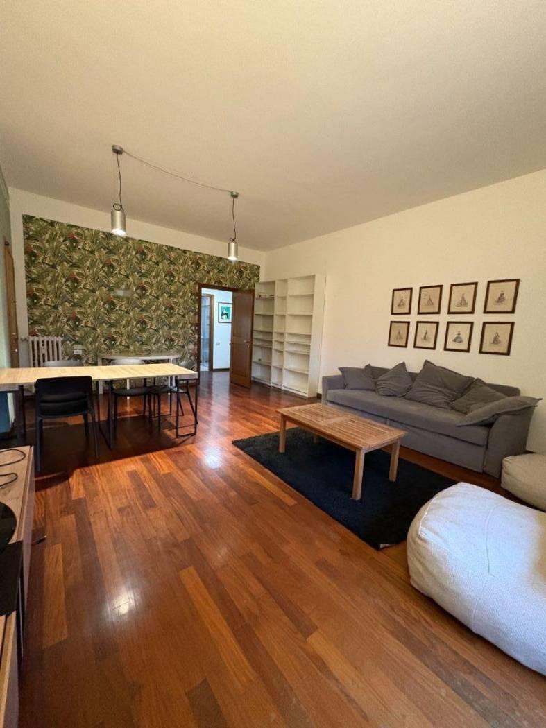 L’immobile si apre su un ampio soggiorno suddiviso in zona living e zona pranzo, rifinito in parquet, con accesso diretto al balcone di proprietà.