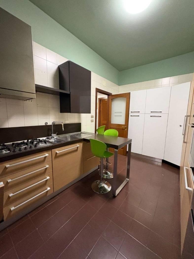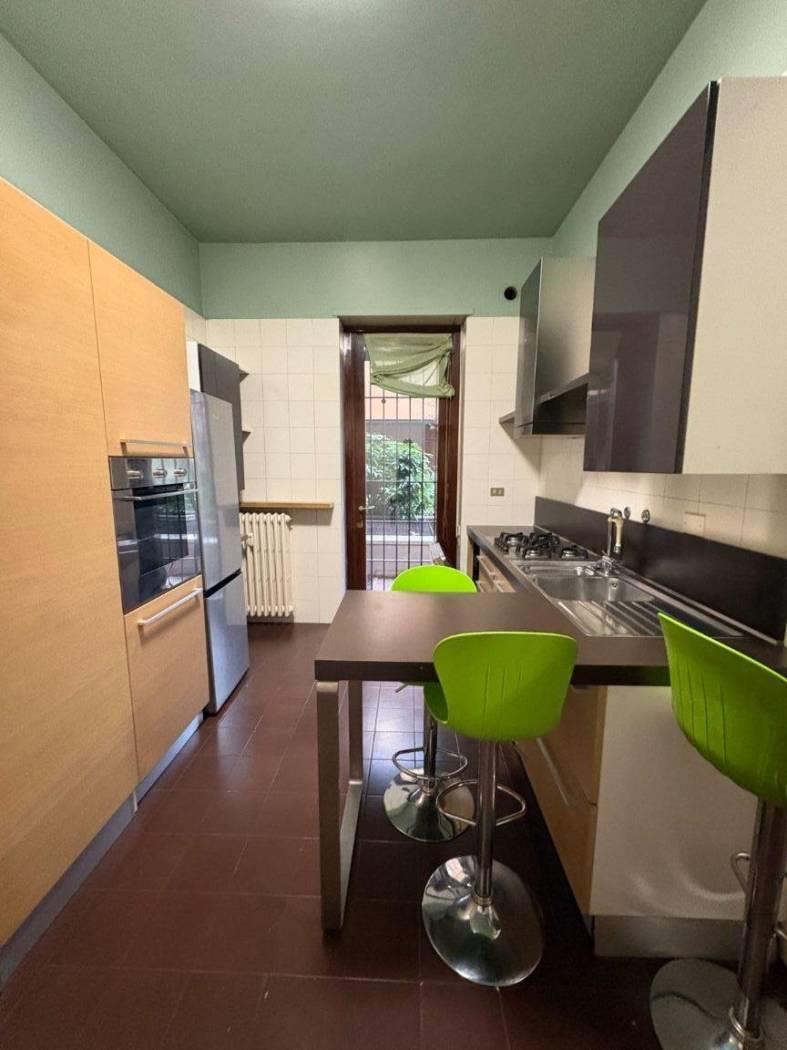 Cucina abitabile di generose dimensioni, completa di elettrodomestici e con porta-finestra