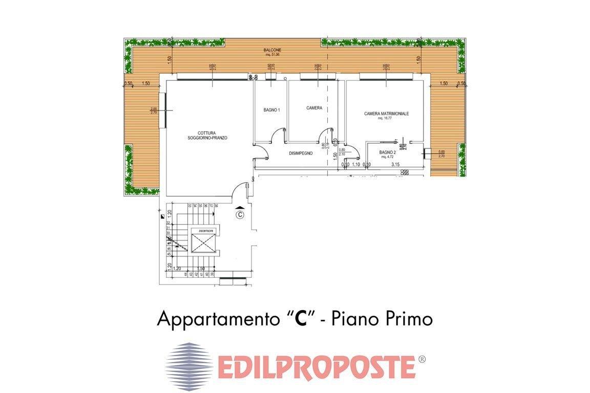 APPARTAMENTO C - Trilocale al primo piano di 100 mq con doppi servizi finestrati, due camere, soggiorno con cucina a vista e ampie vetrate che si affacciano su un terrazzo coperto perimetrale di 64 mq, perfetto per vivere l'esterno in ogni stagione. Ideale per chi cerca comodità su un unico livello e ampie superfici outdoor da sfruttare tutto l'anno.