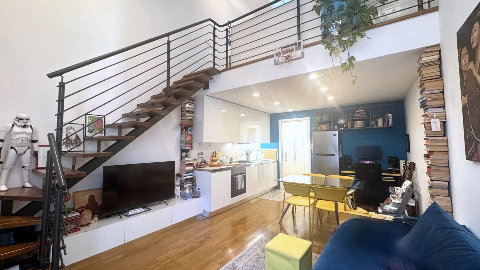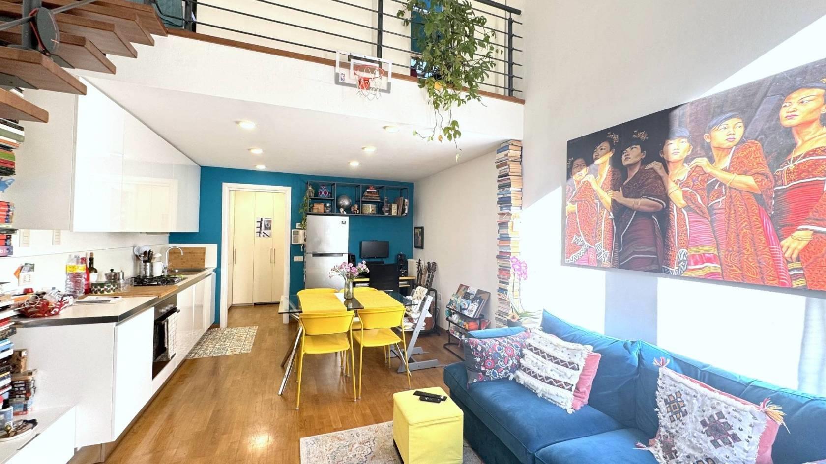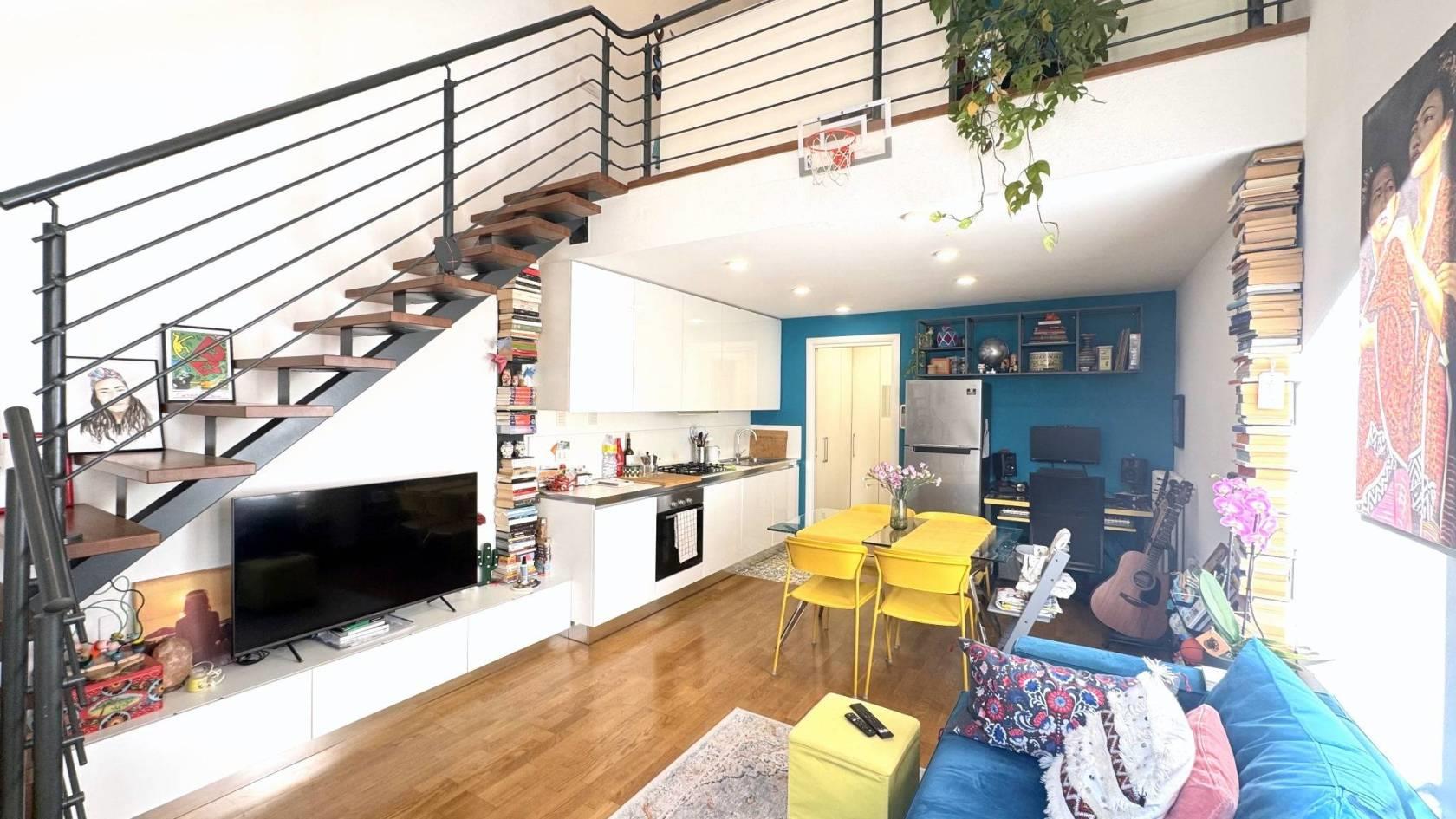L’abitazione si sviluppa su due livelli con soppalco. Dall’ingresso si viene accolti dalla zona soggiorno con angolo cottura di grande impatto visivo, grazie all’altezza che raggiunge i 5,50 metri e alla vista sul soppalco che dona profondità e carattere all’ambiente. L’ambiente è facilmente organizzabile in area pranzo e zona living. Un disimpegno funzionale con spazio per armadio e un bagno completo con doccia completa il piano terra.