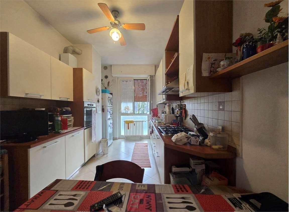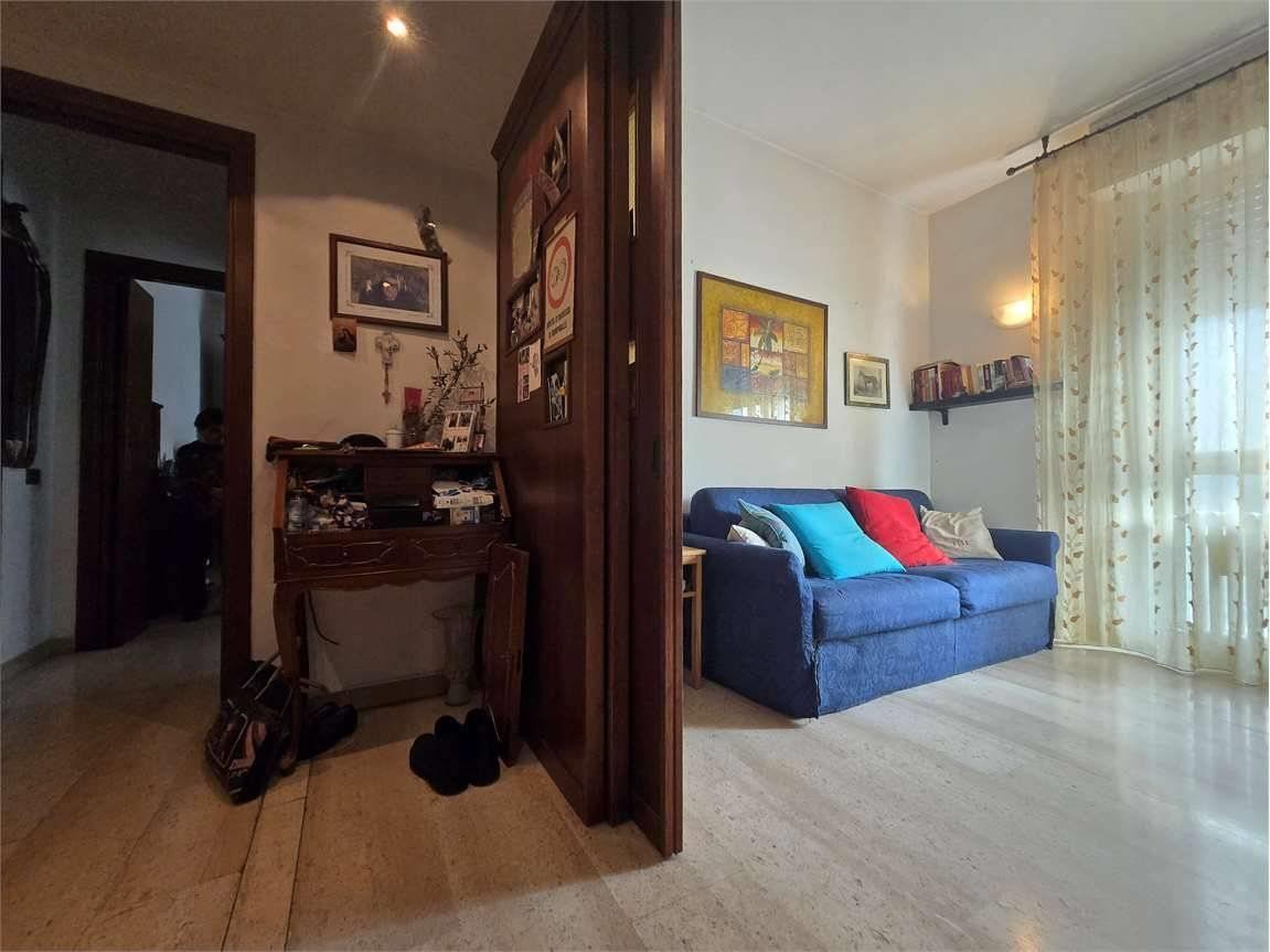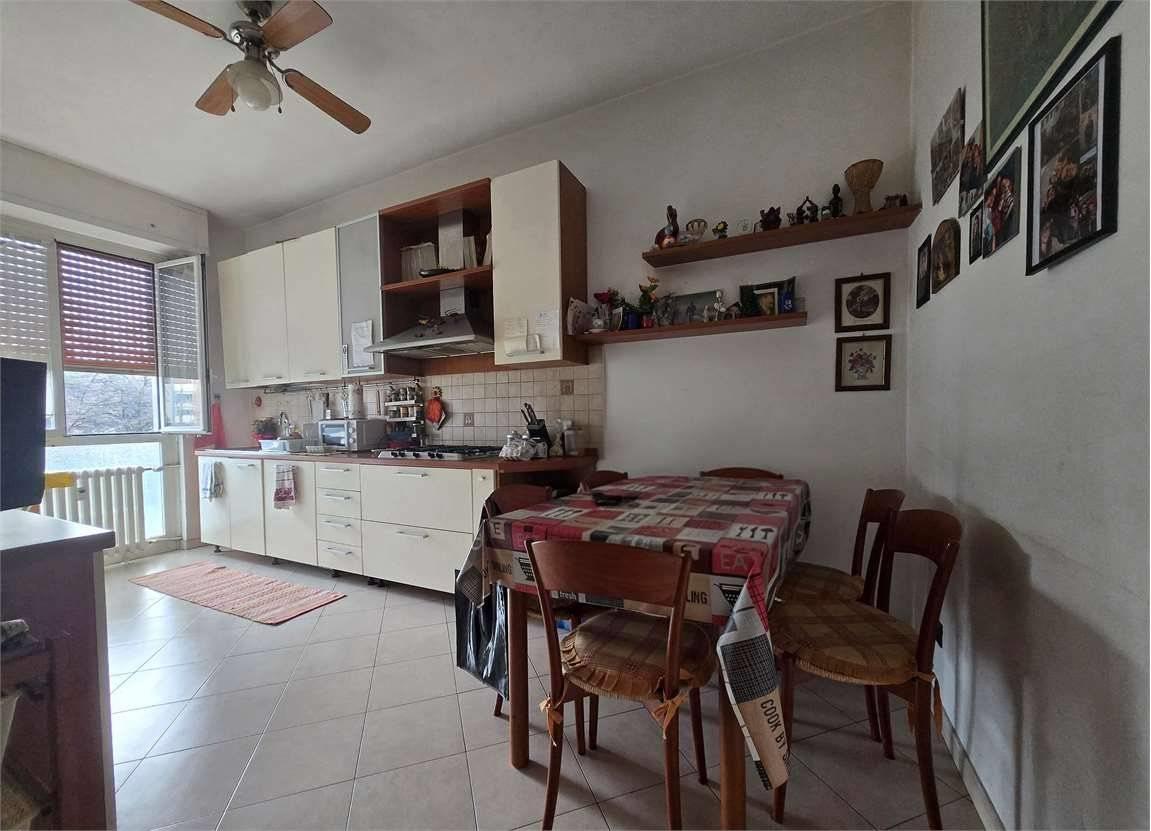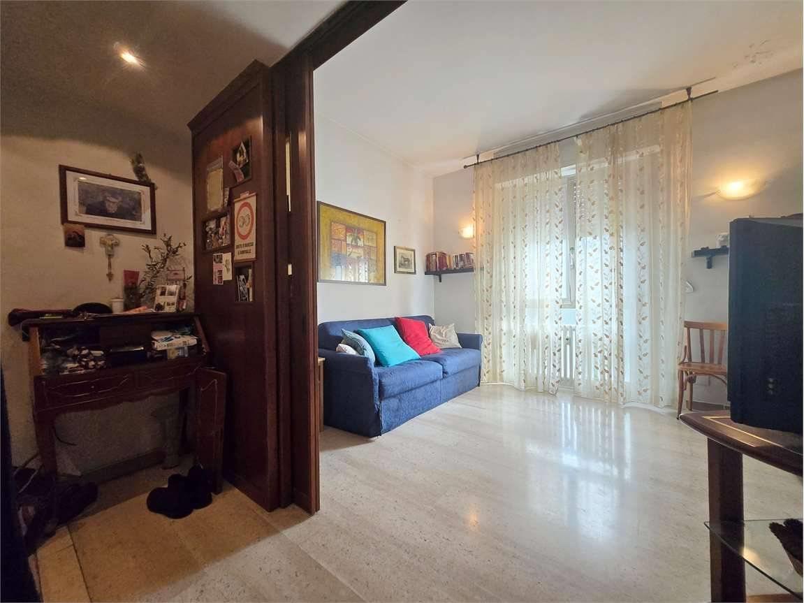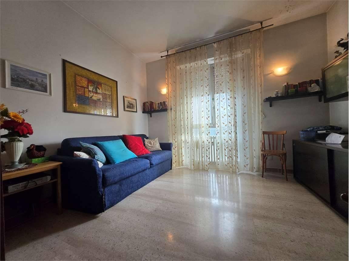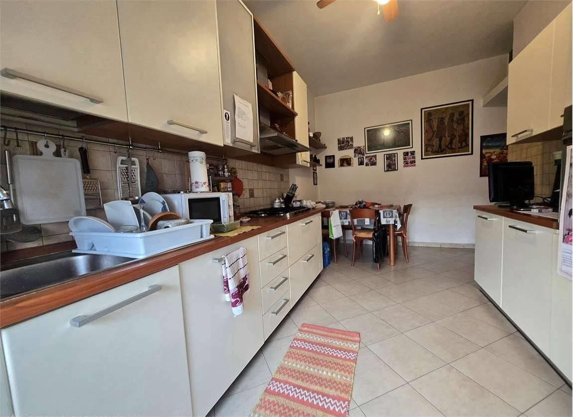 La cucina è abitabile, spaziosa e separata dal soggiorno. La zona notte è composta da una camera matrimoniale di generose dimensioni, con accesso diretto al balcone dotato di inferiata. Il bagno, disposto in lunghezza, è completo di doccia.