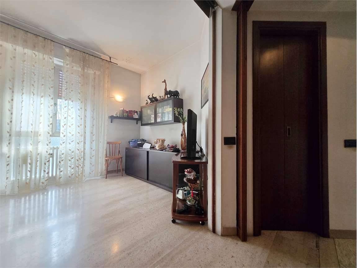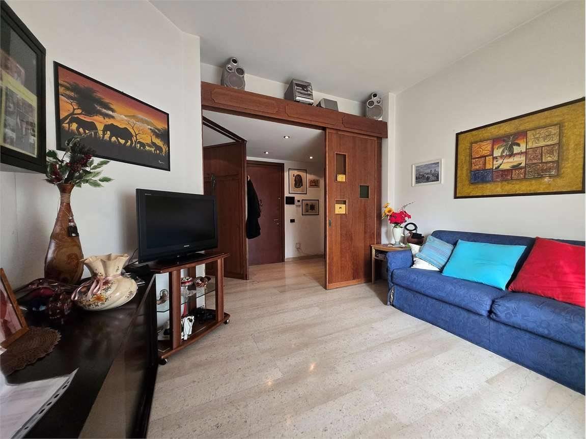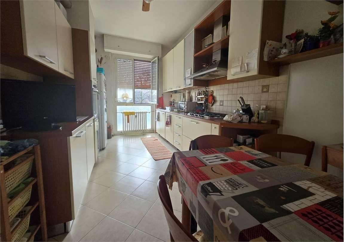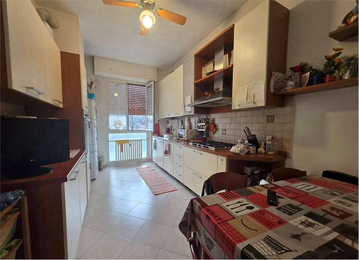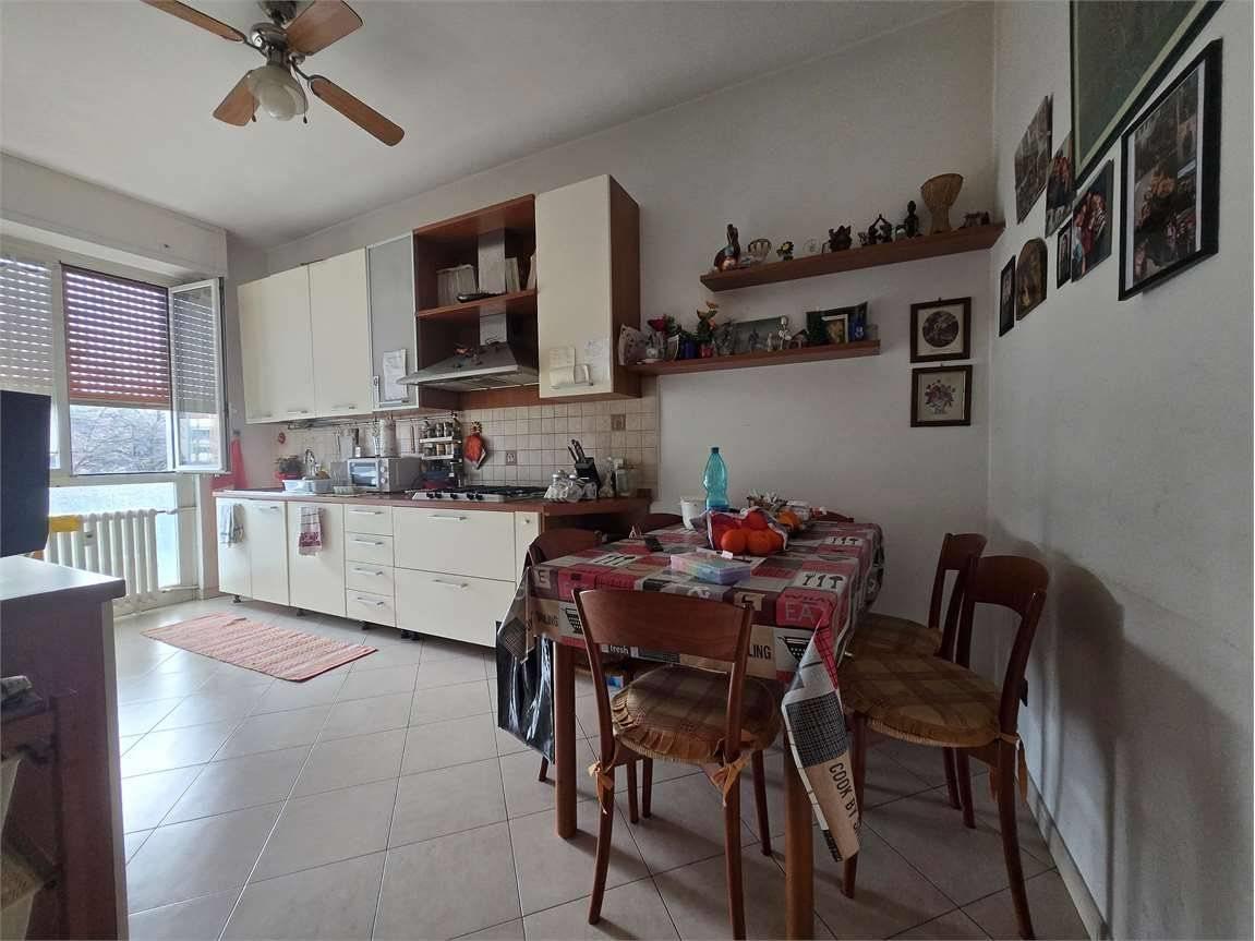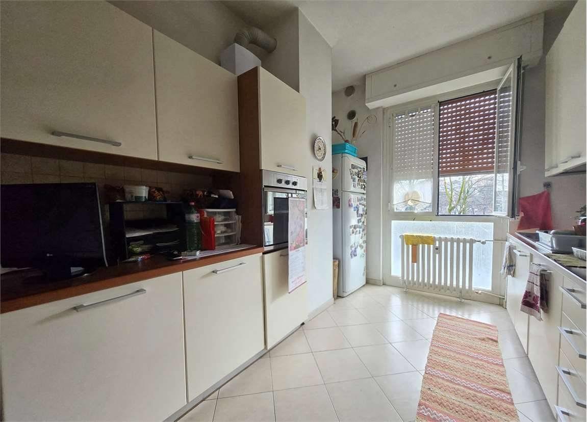 La cucina è abitabile, spaziosa e separata dal soggiorno. La zona notte è composta da una camera matrimoniale di generose dimensioni, con accesso diretto al balcone dotato di inferiata. Il bagno, disposto in lunghezza, è completo di doccia.