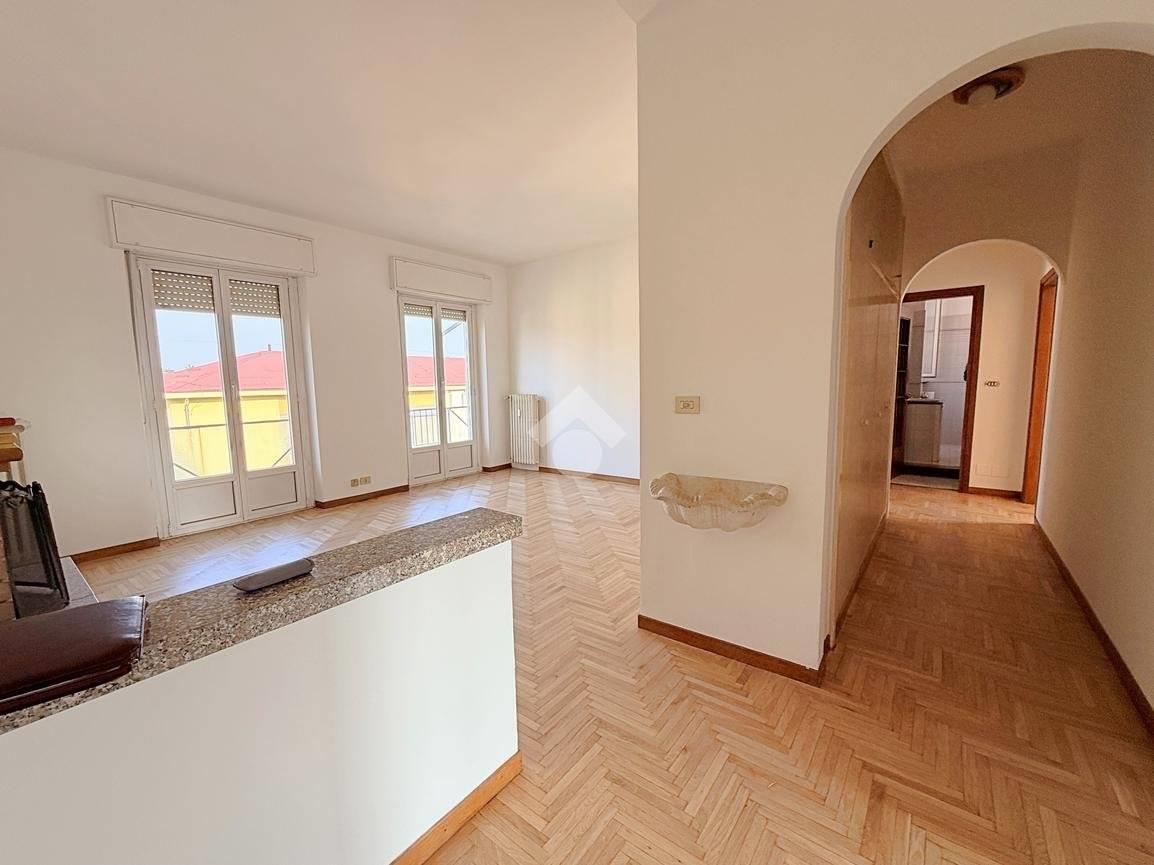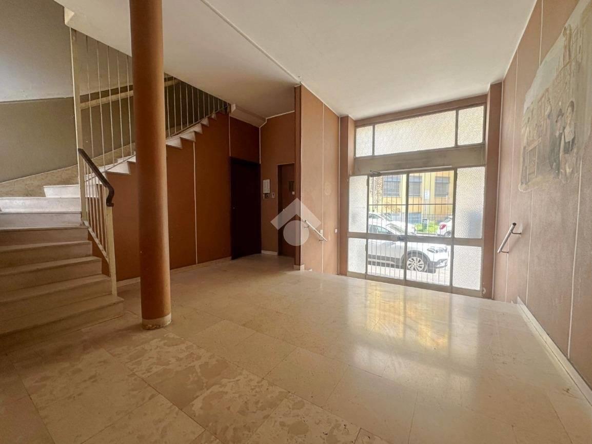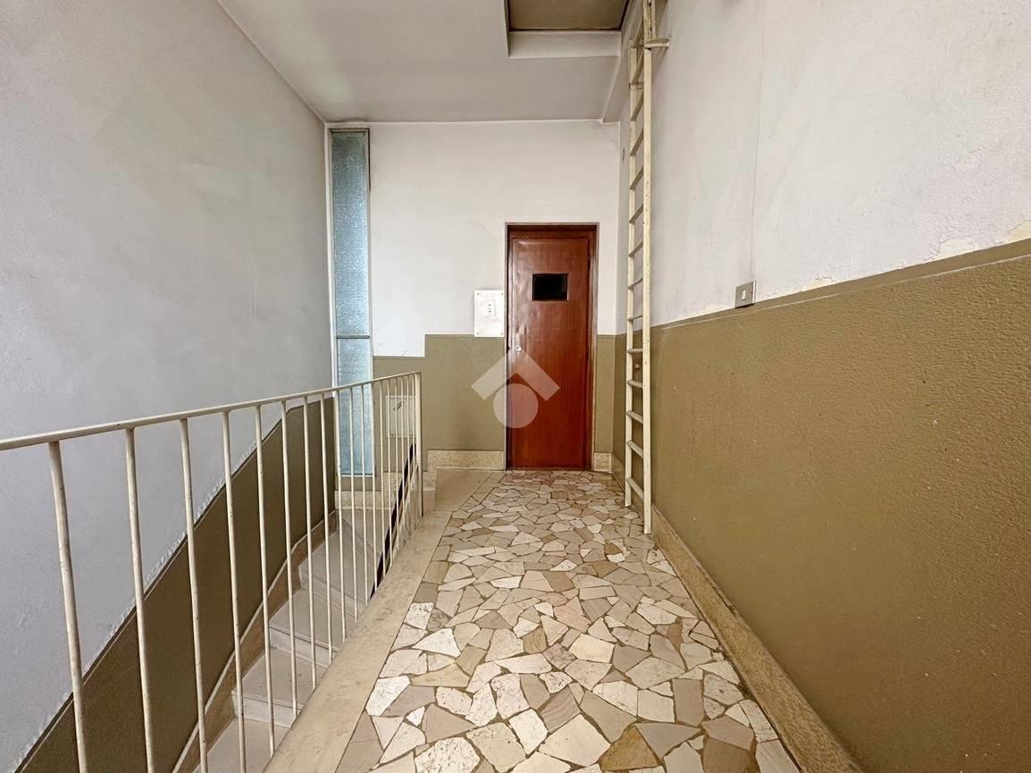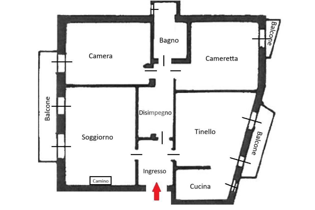 L’appartamento di 99 mq è caratterizzato da ingresso, soggiorno con camino con doppia porta finestrata con accesso al primo balcone, tinello e cucina abitabile con affaccio sul secondo balcone, disimpegno, camera matrimoniale anch’essa con affaccio sul balcone del soggiorno, bagno finestrato con sanitari sospesi, doccia e vasca e cameretta di generose metrature con affaccio sul terzo balcone.