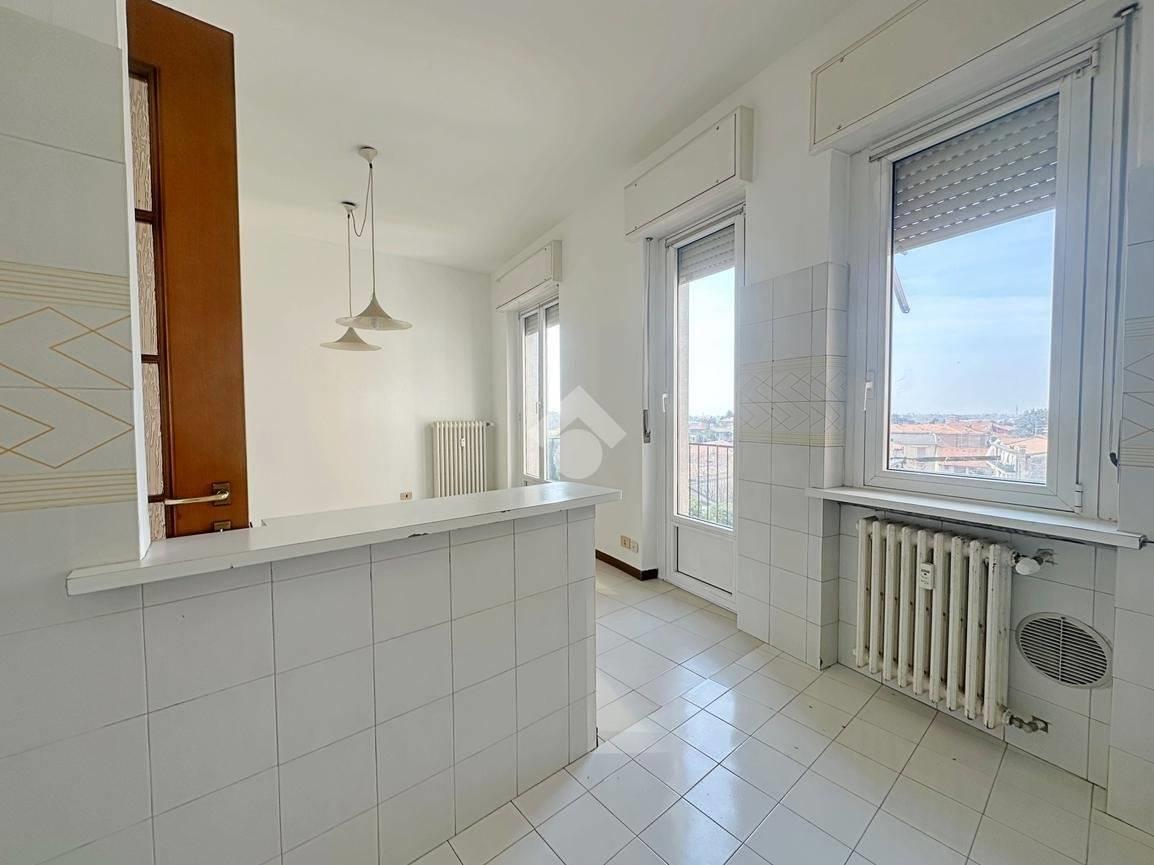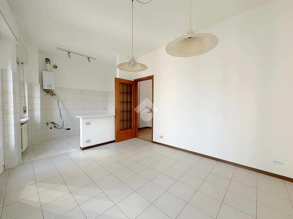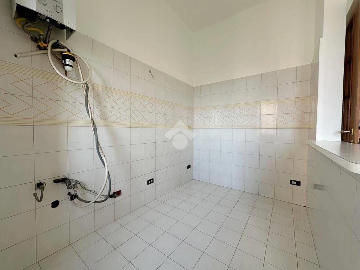 L’appartamento di 99 mq è caratterizzato da ingresso, soggiorno con camino con doppia porta finestrata con accesso al primo balcone, tinello e cucina abitabile con affaccio sul secondo balcone, disimpegno, camera matrimoniale anch’essa con affaccio sul balcone del soggiorno, bagno finestrato con sanitari sospesi, doccia e vasca e cameretta di generose metrature con affaccio sul terzo balcone.