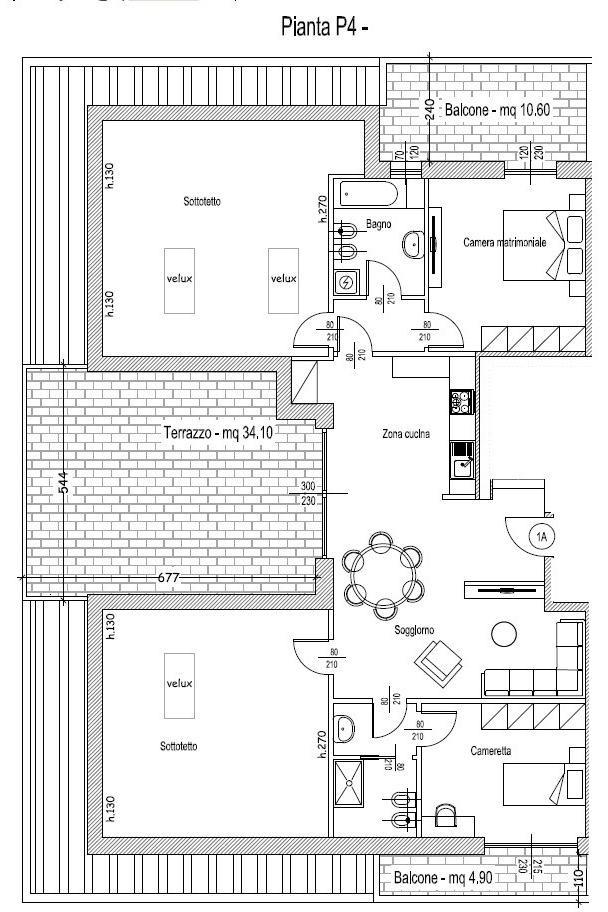 Attico di 138 mq, sito al QUARTO PIANO, composto da ingresso che porta al luminoso ed ampio soggiorno con cucina a vista, terrazzo di 34,10 mq, cameretta con sfogo su balcone di 4,90 mq, bagno con box doccia, camera matrimoniale e bagno con vasca, entrambi con sfogo su terrazzo di 10,60 mq, due sottotetti.