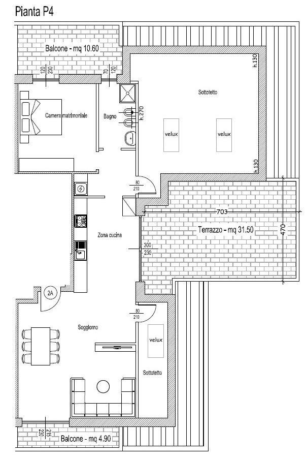 Attico di 123 mq, sito al QUARTO PIANO, composto da ingresso che porta al luminoso ed ampio soggiorno con cucina a vista, terrazzo di 31,50 mq, balcone di 4,90 mq, disimpegno, camera matrimoniale e bagno con box doccia, entrambi con sfogo su terrazzo di 10,60 mq, due sottotetti.
