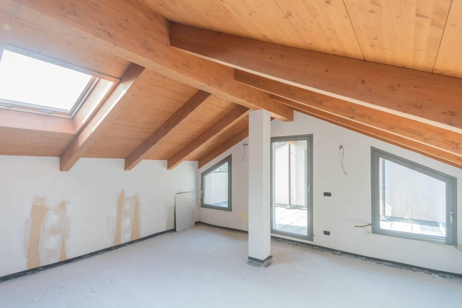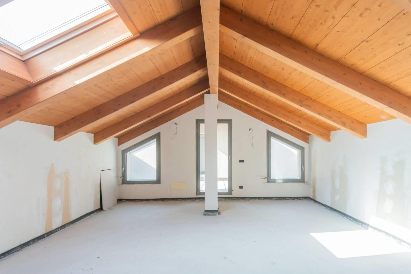 L’ingresso si apre su un ampio e luminoso soggiorno, affacciato su un balcone, collegato a una comoda cucina abitabile. La zona notte è composta da tre camere da letto, due bagni finestrati e un pratico ripostiglio. Al piano superiore si sviluppa un grande open space mansardato, molto luminoso, con accesso a un terrazzo privato.