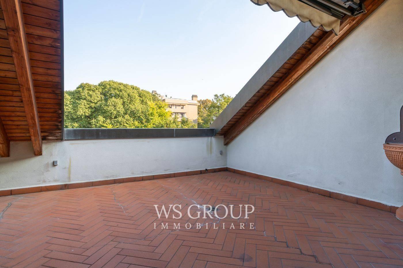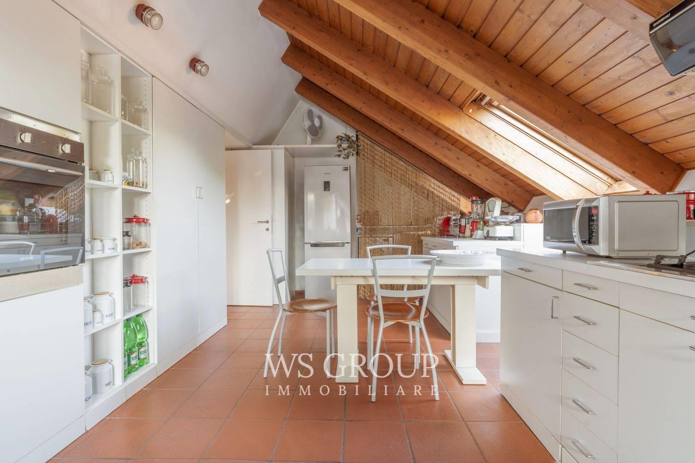 La scala interna conduce al piano superiore, dove si apre una grande zona living con cucina a vista, completata da un bagno/lavanderia e dal terrazzo di circa 25 mq che si affaccia sui giardini interni della residenza; un autentico rifugio urbano, silenzioso e riservato.