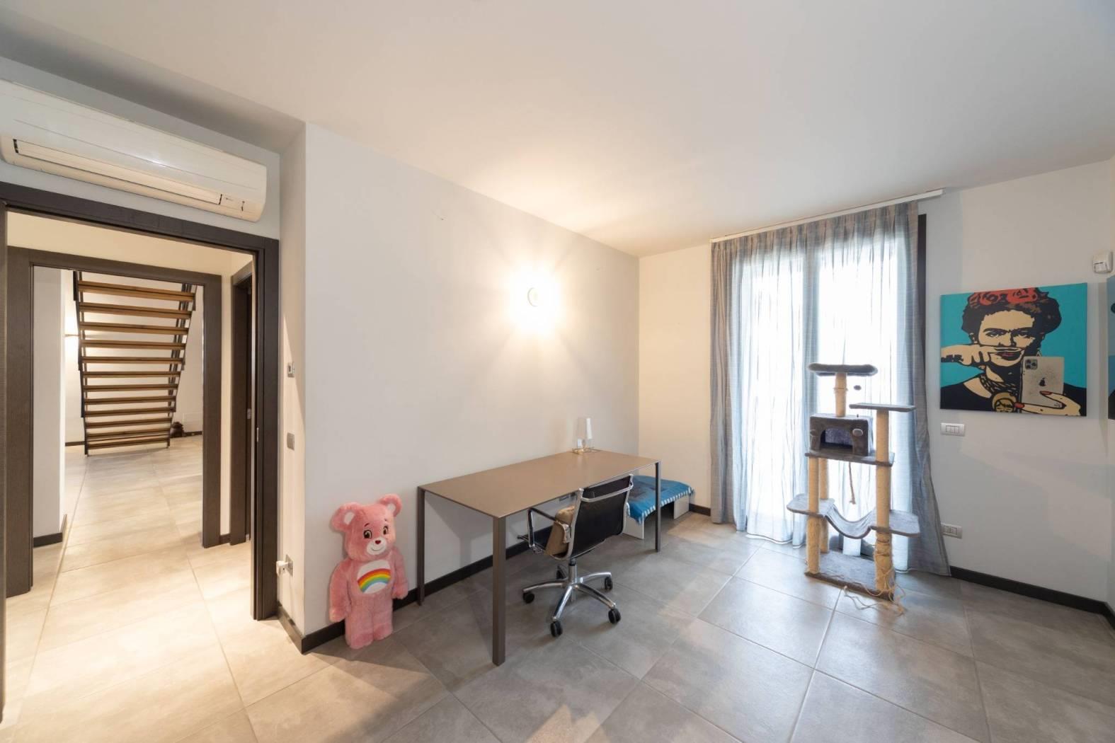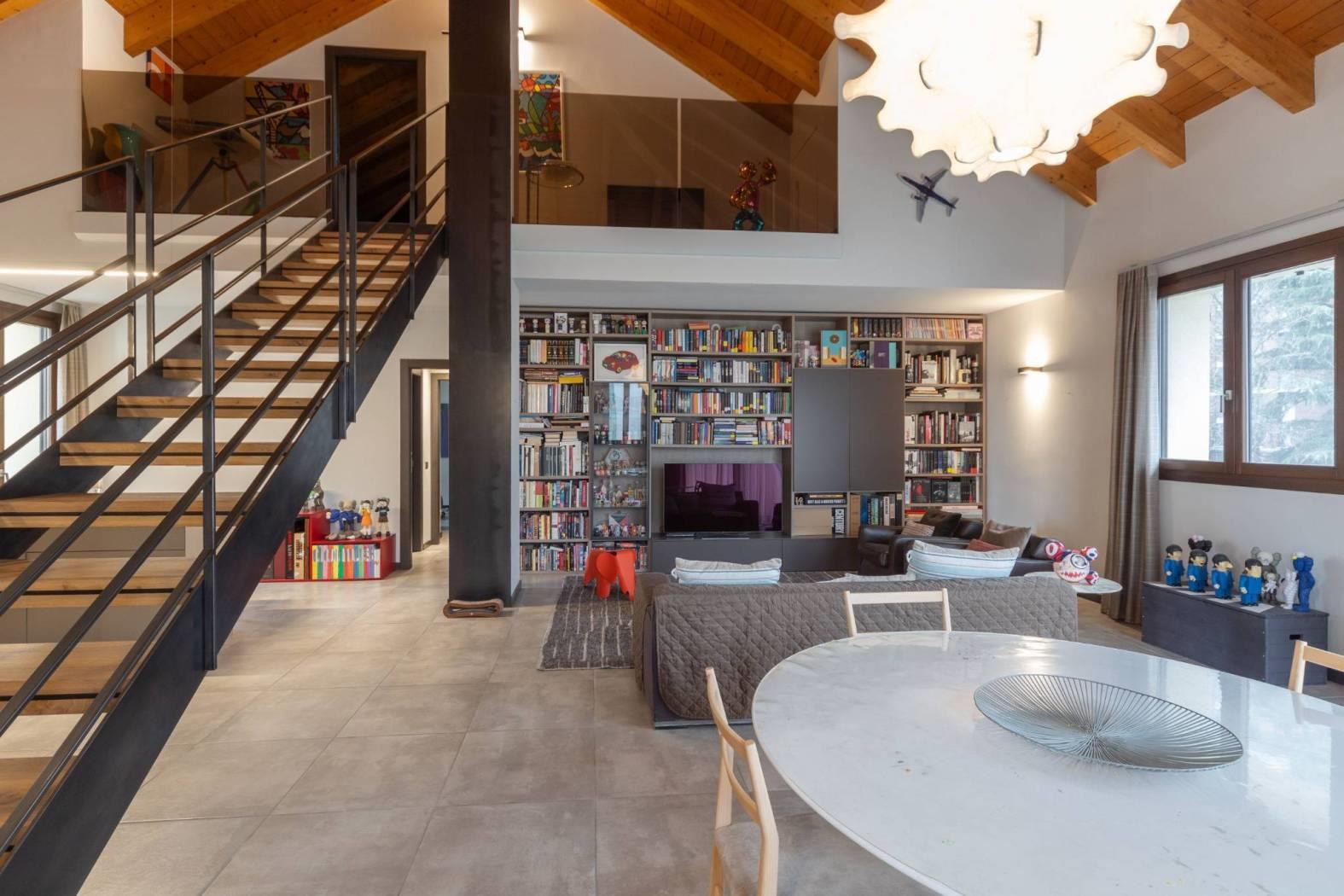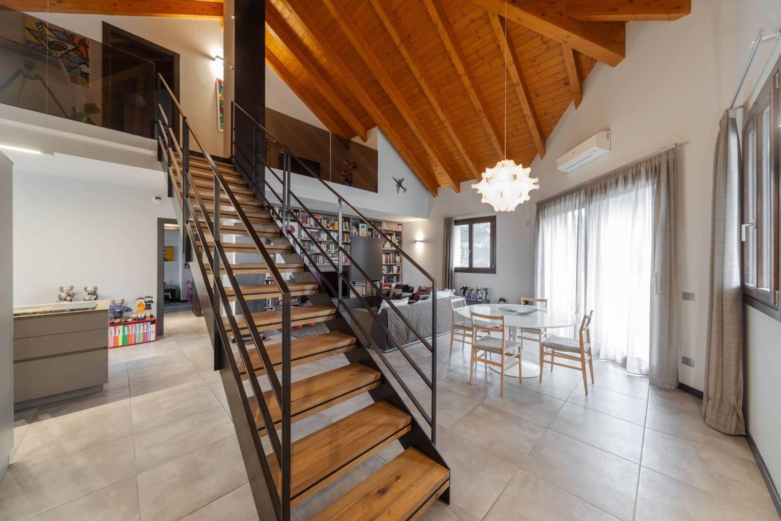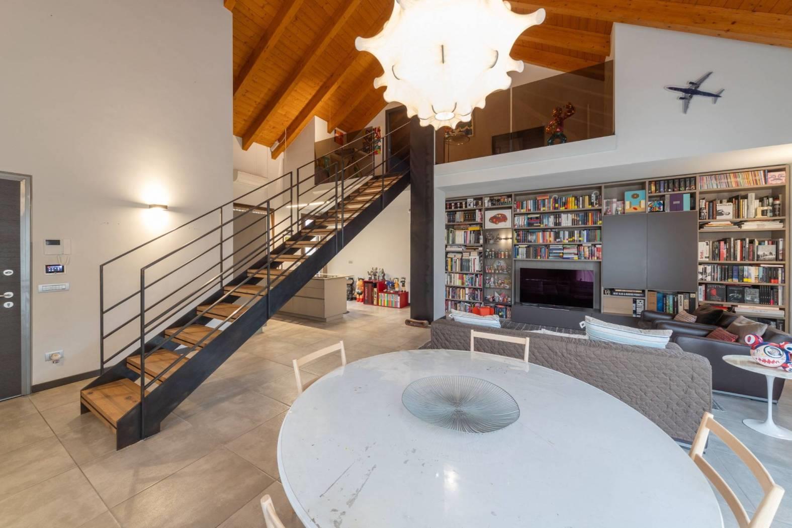 Dal soppalco si accede alla camera padronale mansardata, completa di bagno privato, cabina armadio e camino a bioetanolo, perfetto per creare un’atmosfera romantica e accogliente. La presenza di questi elementi rende la suite padronale un vero rifugio all’interno della casa.