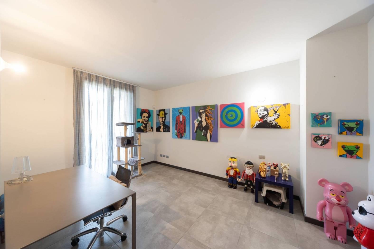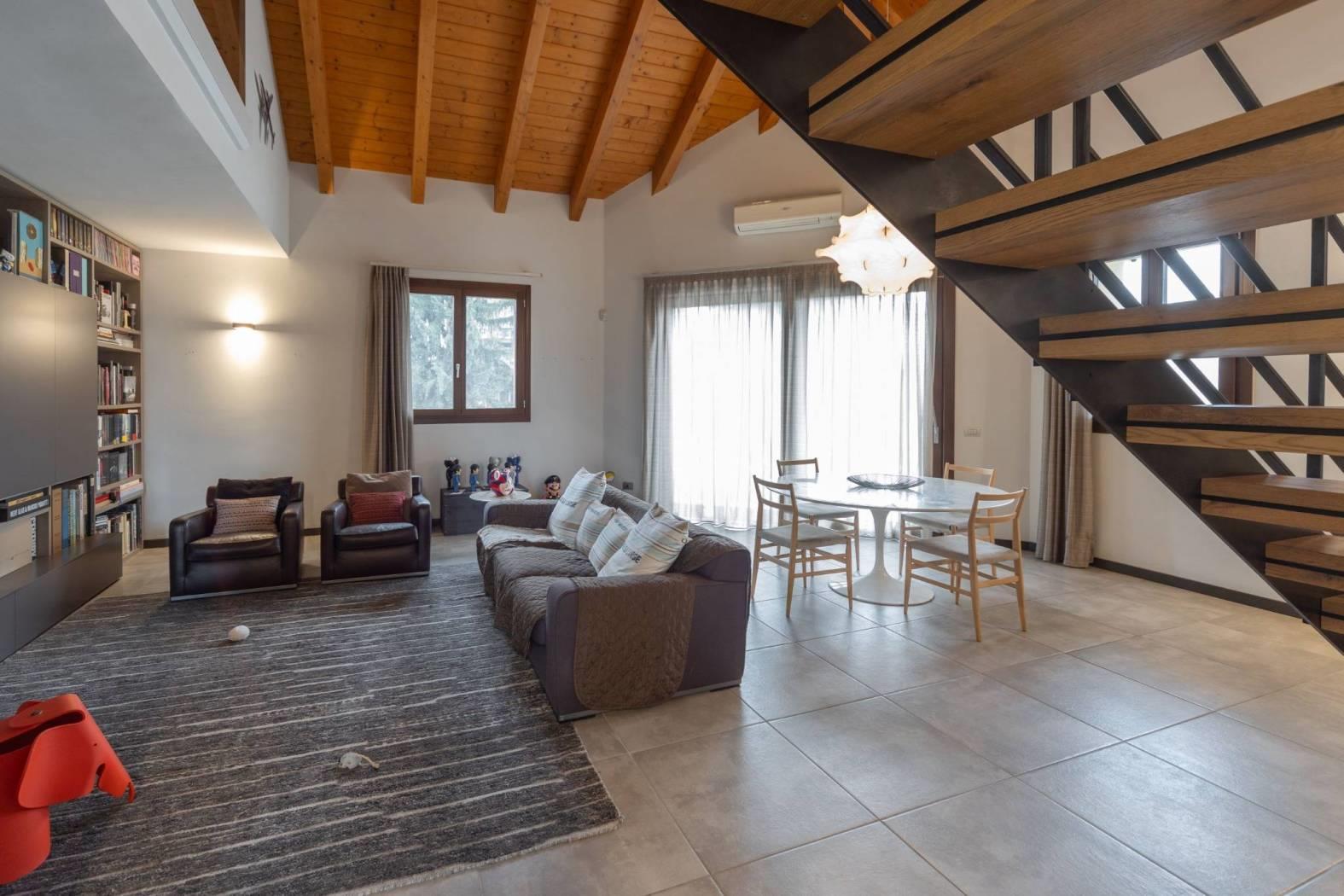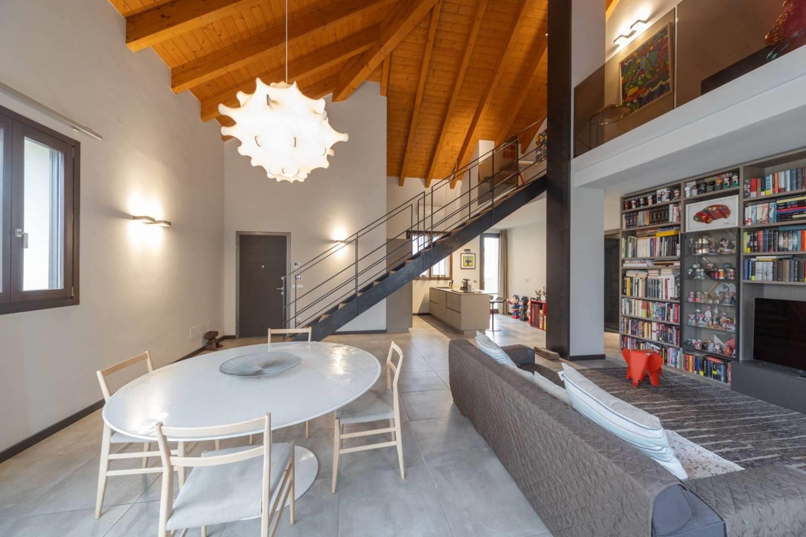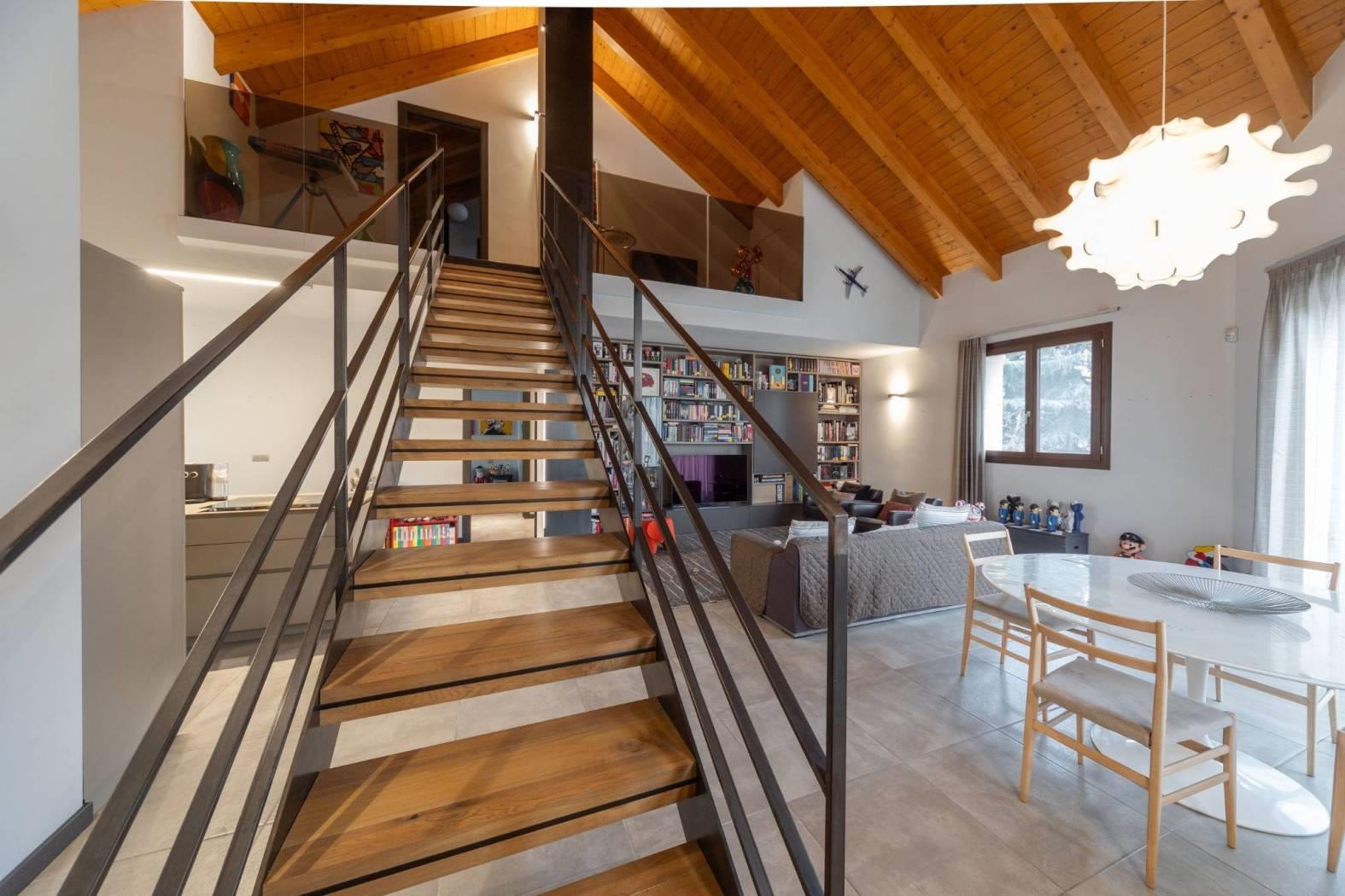 Dal soppalco si accede alla camera padronale mansardata, completa di bagno privato, cabina armadio e camino a bioetanolo, perfetto per creare un’atmosfera romantica e accogliente. La presenza di questi elementi rende la suite padronale un vero rifugio all’interno della casa.