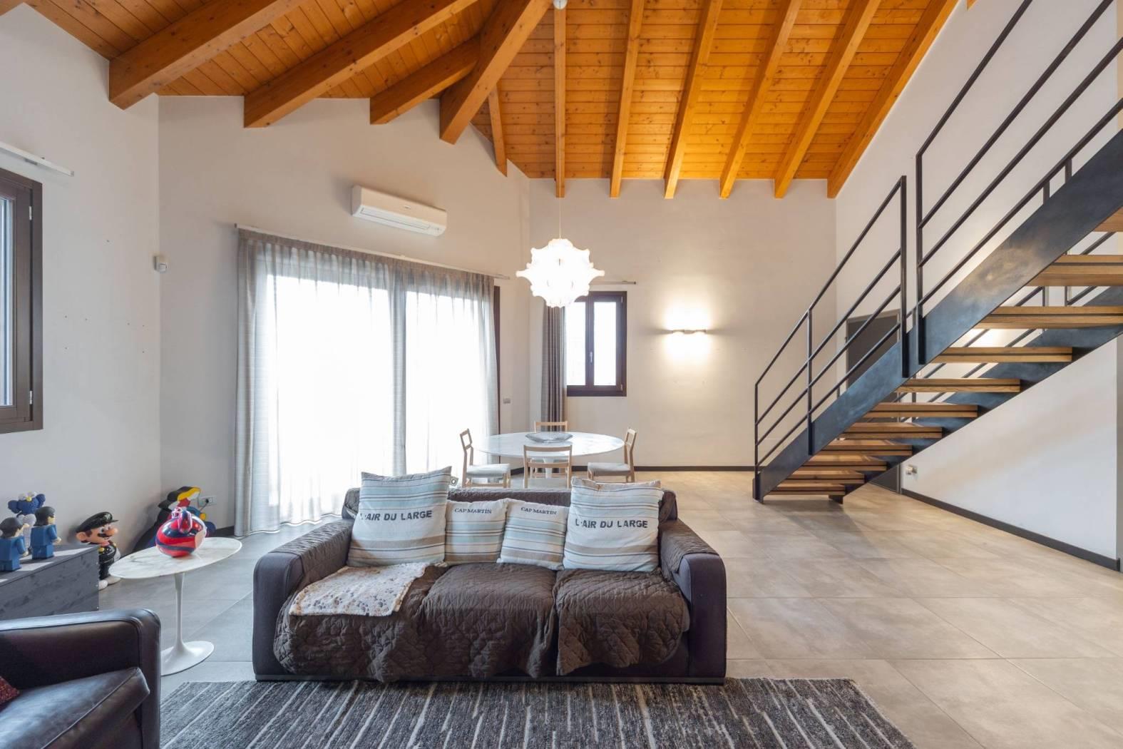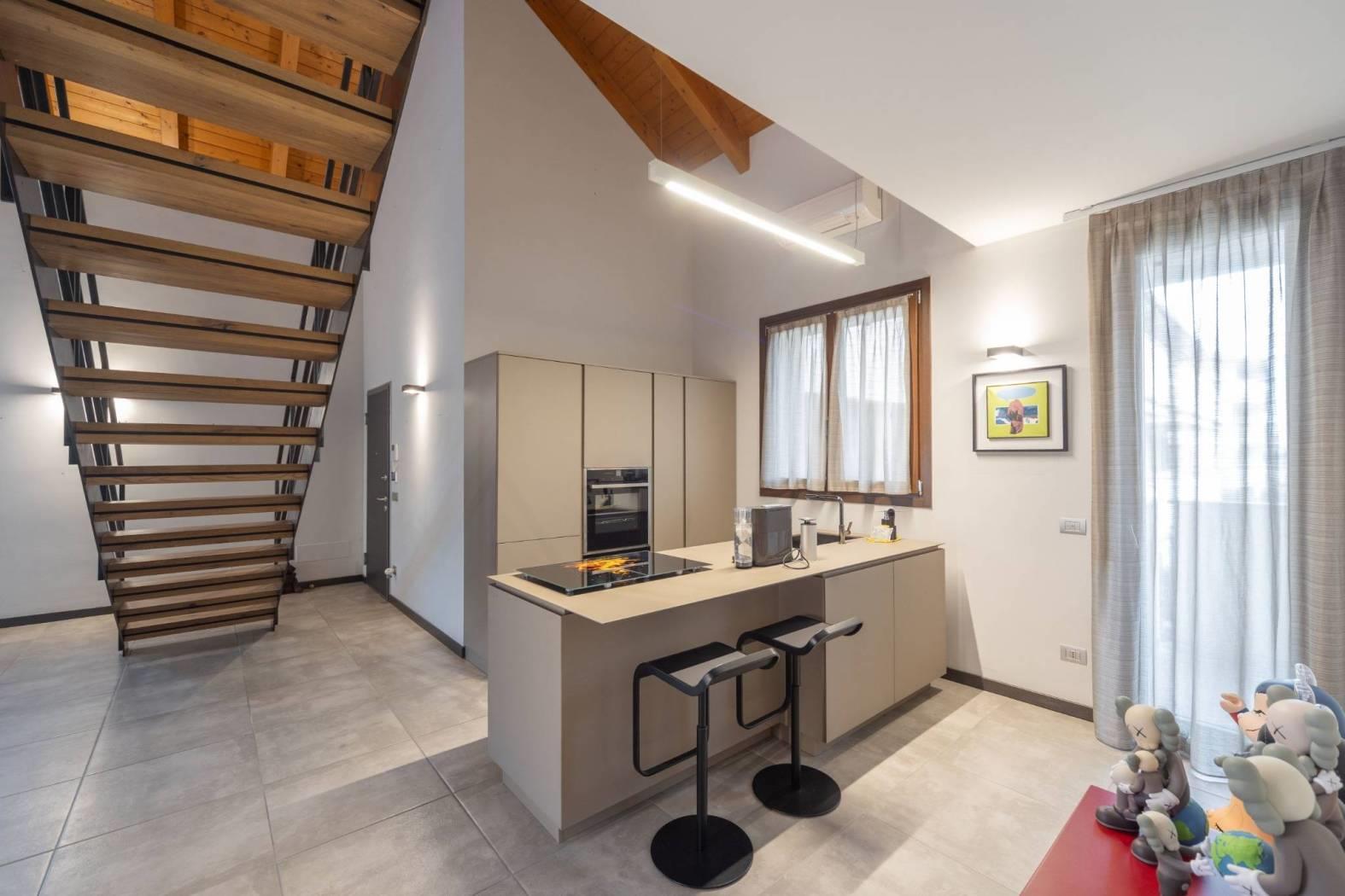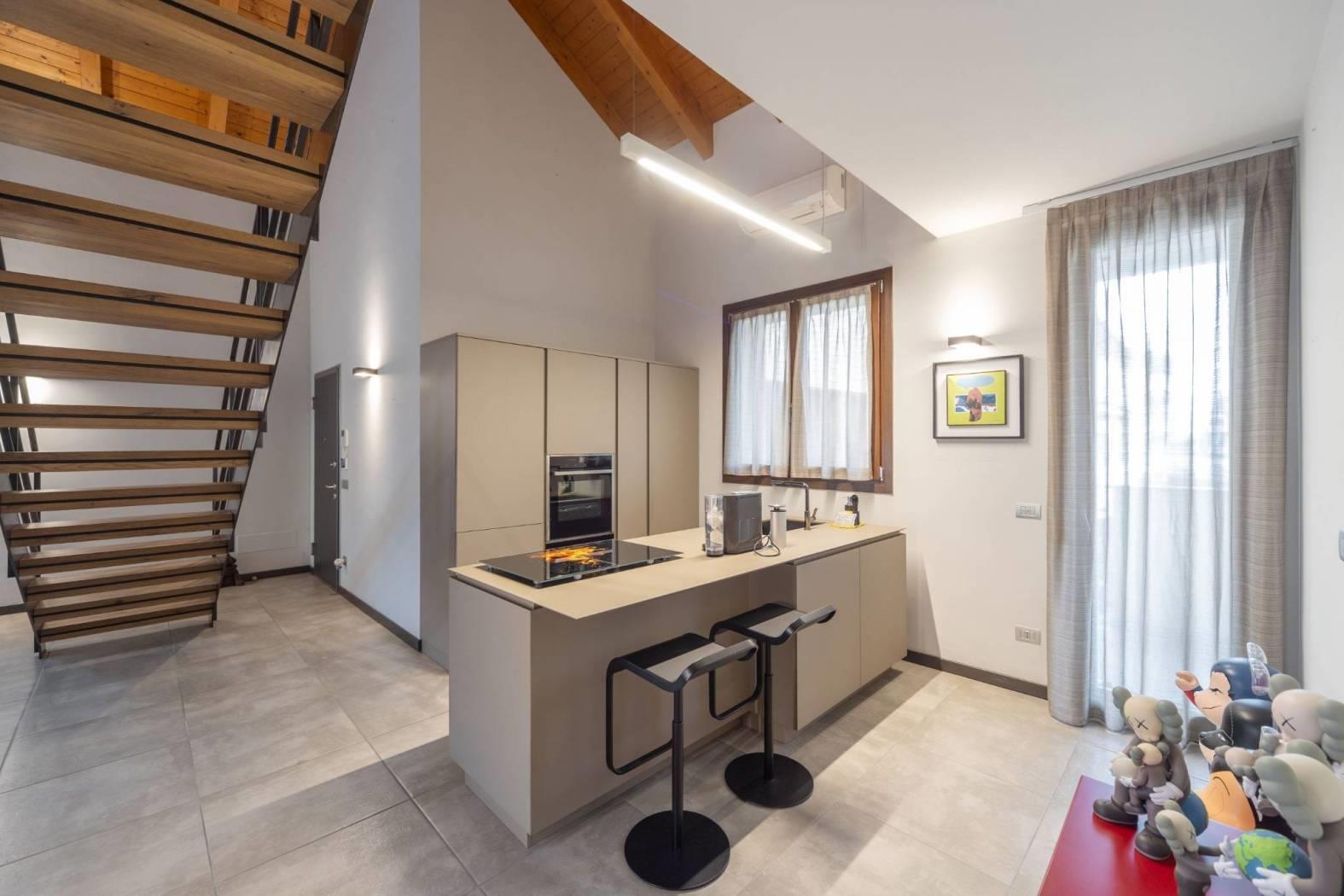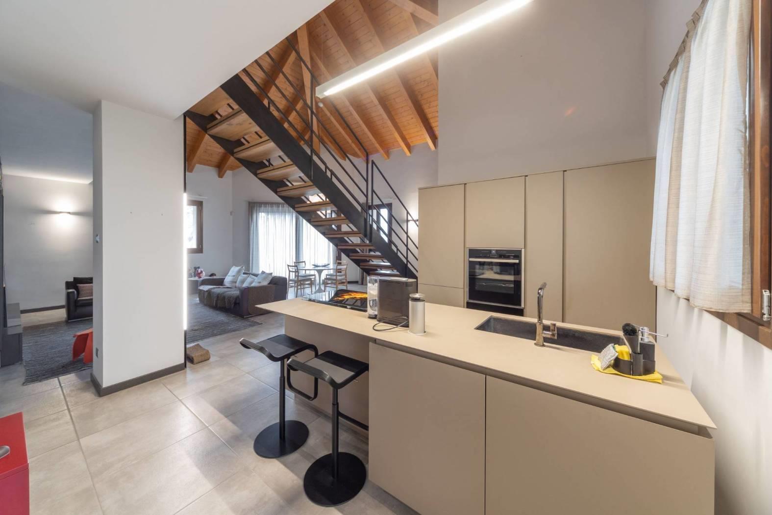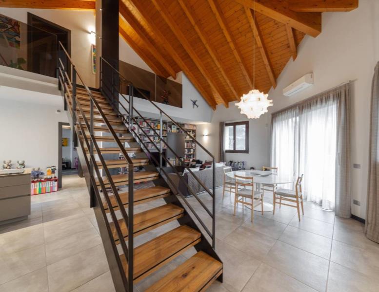 L’appartamento vanta finiture di pregio, con pavimenti e dettagli scelti fuori capitolato. Il soffitto con travi a vista aggiunge ulteriore fascino, rendendo la soluzione abitativa unica e di grande appeal. Ogni dettaglio è stato pensato per offrire estetica e funzionalità.