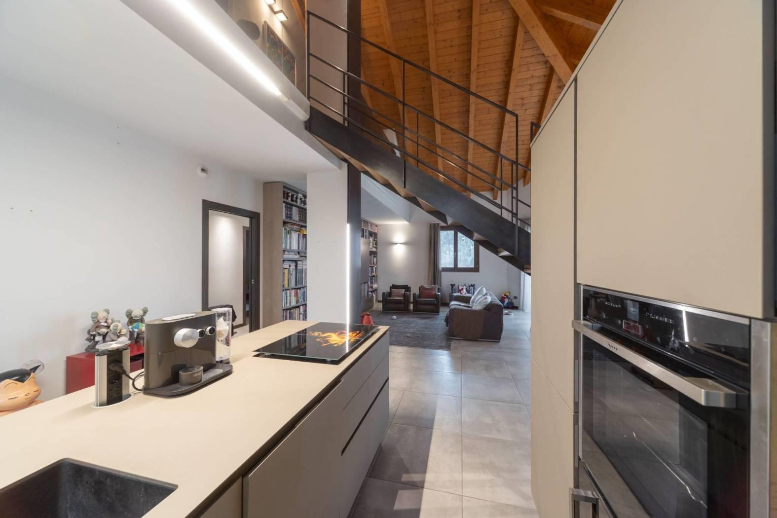 L’ingresso privato, valorizzato da una piccola aiuola e da una scala di proprietà, conduce direttamente al primo piano, dove si può apprezzare l’architettura moderna dell’appartamento. La zona giorno si presenta con un ampio soggiorno open space che include anche la cucina, balcone e terrazza. Un elemento di particolare pregio è la scala interna che collega al soppalco, conferendo all’ambiente un tocco distintivo e raffinato.