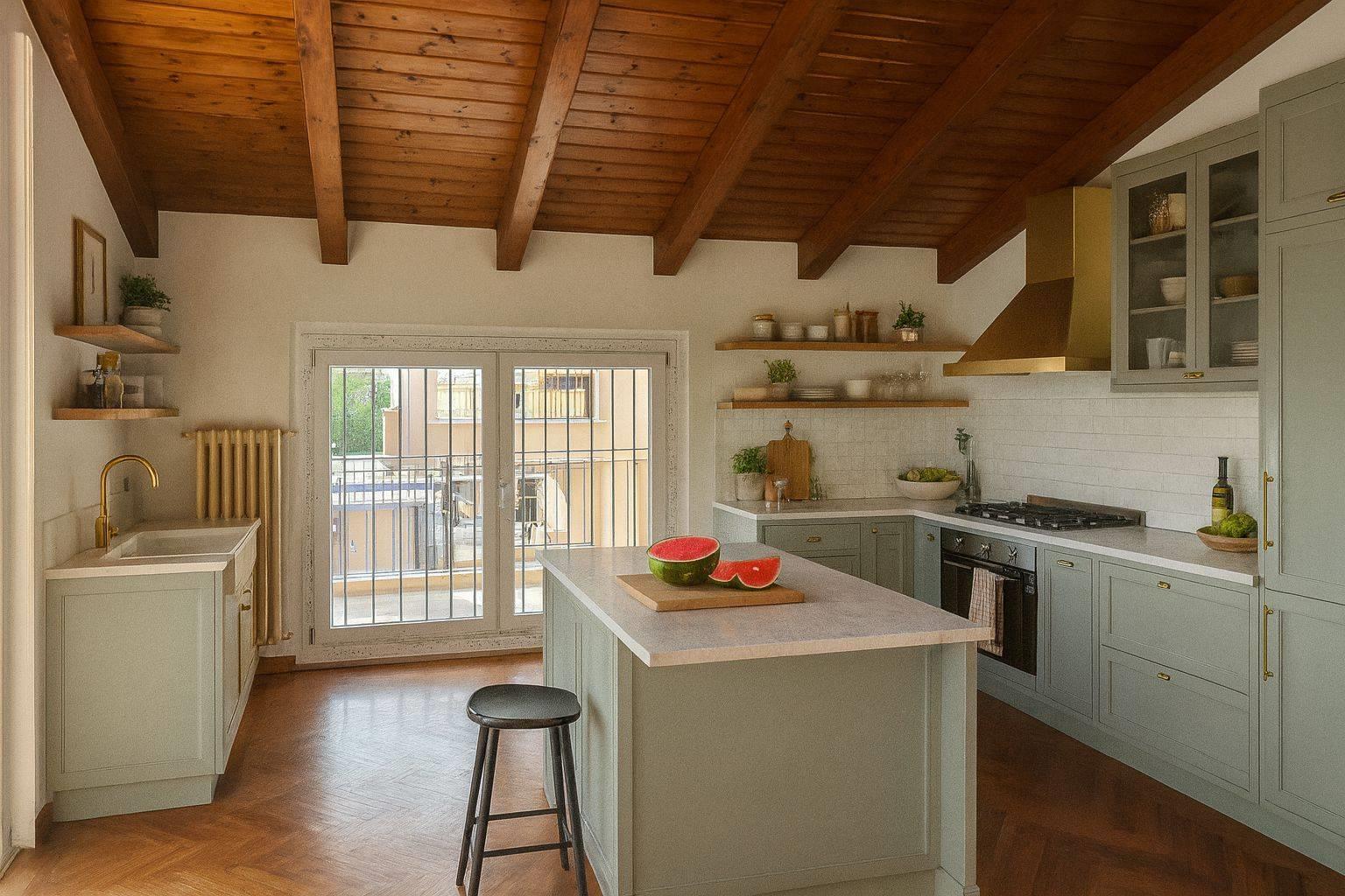 La zona giorno è ampia e luminosa, arricchita da un camino che dona calore e carattere all’ambiente, con cucina a vista.