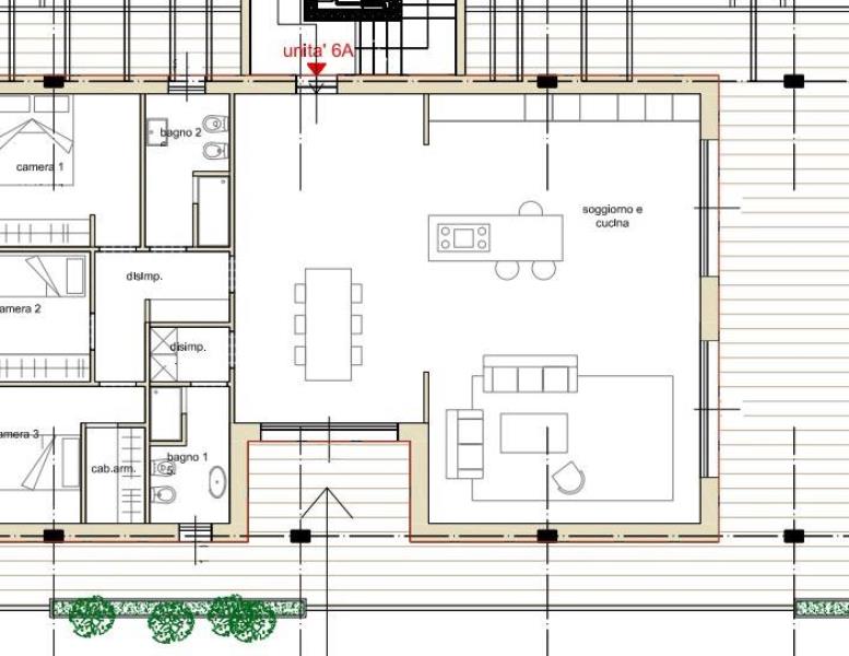L'appartamento che presentiamo è un attico di quattro locali, posto al piano secondo ed è così composto: l'ingresso si apre sull'ampia e luminosa zona giorno living con cucina a vista, completa di portafinestra con accesso al terrazzo. A servire la zona giorno abbiamo un primo bagno finestrato.