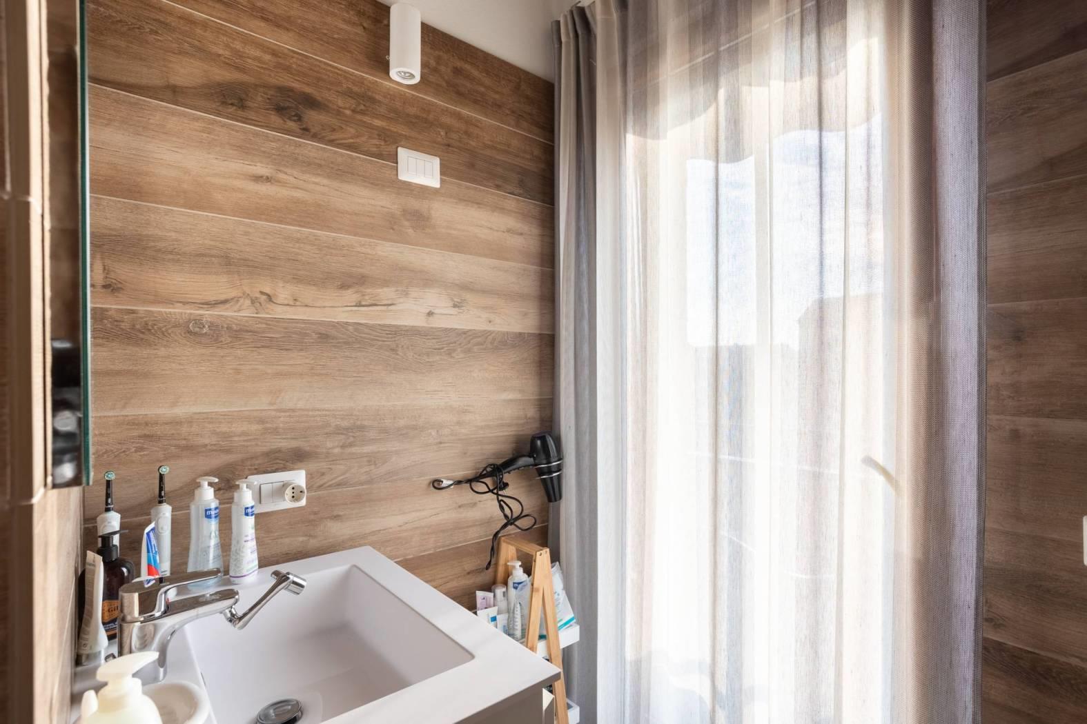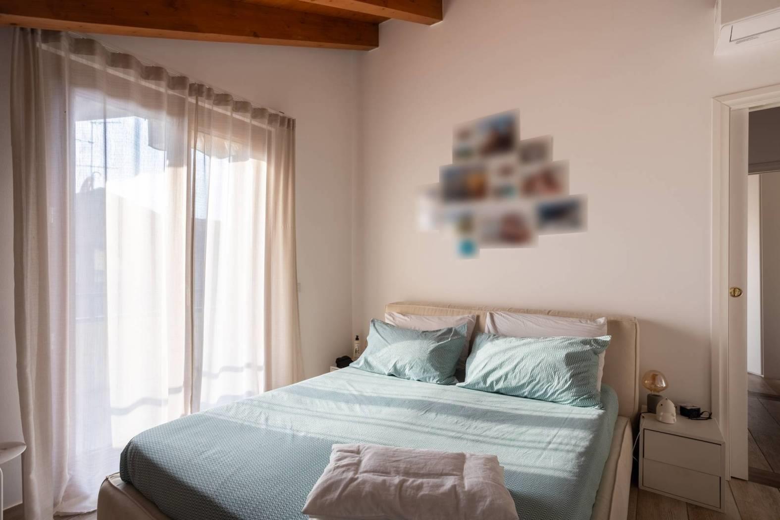 La camera matrimoniale e la cameretta, ideale per i più piccoli o come studio, si affacciano su un'ulteriore balconata. Il bagno è moderno e funzionale. Grazie alla tripla esposizione e alle ampie superfici vetrate, la luce naturale inonda ogni angolo della casa.