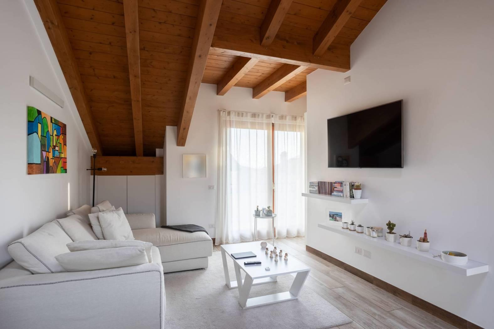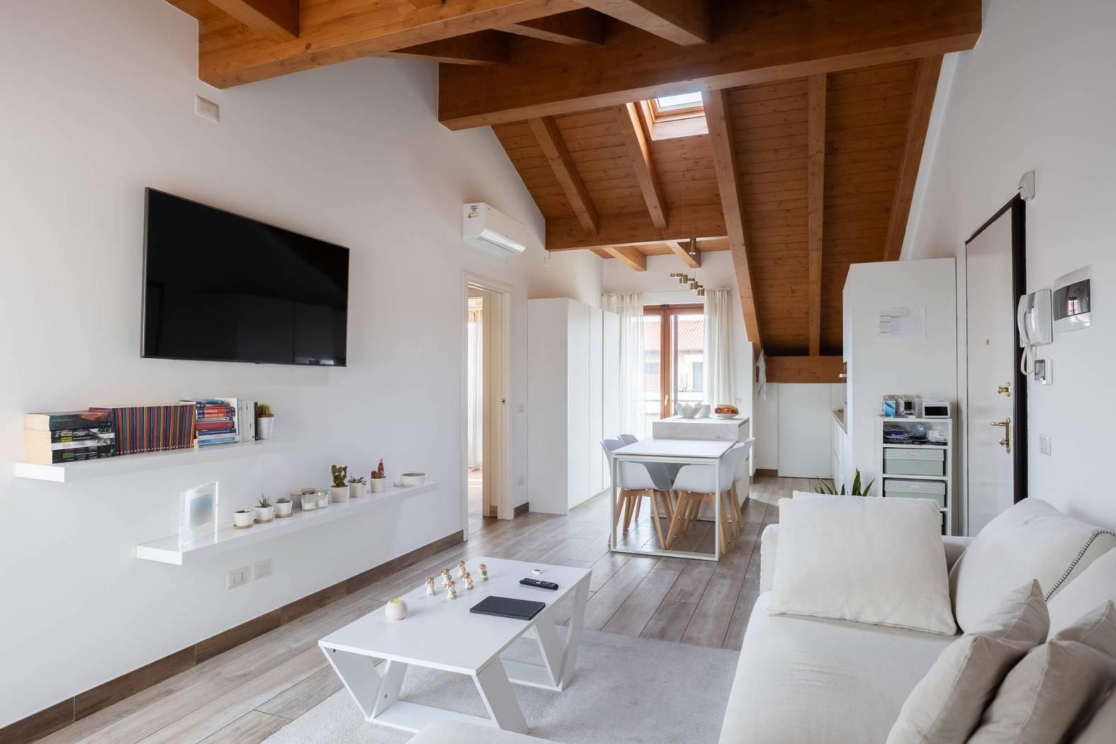 Scopri questo splendido attico di 3 locali mansardato, un vero rifugio di tranquillità e comfort. Completato nel 2016, l'immobile vanta finiture di alta qualità e pavimenti in gres effetto legno che conferiscono un tocco di eleganza. La zona giorno, luminosa e accogliente, si apre su due terrazzini, perfetti per godere di momenti di relax all'aria aperta.