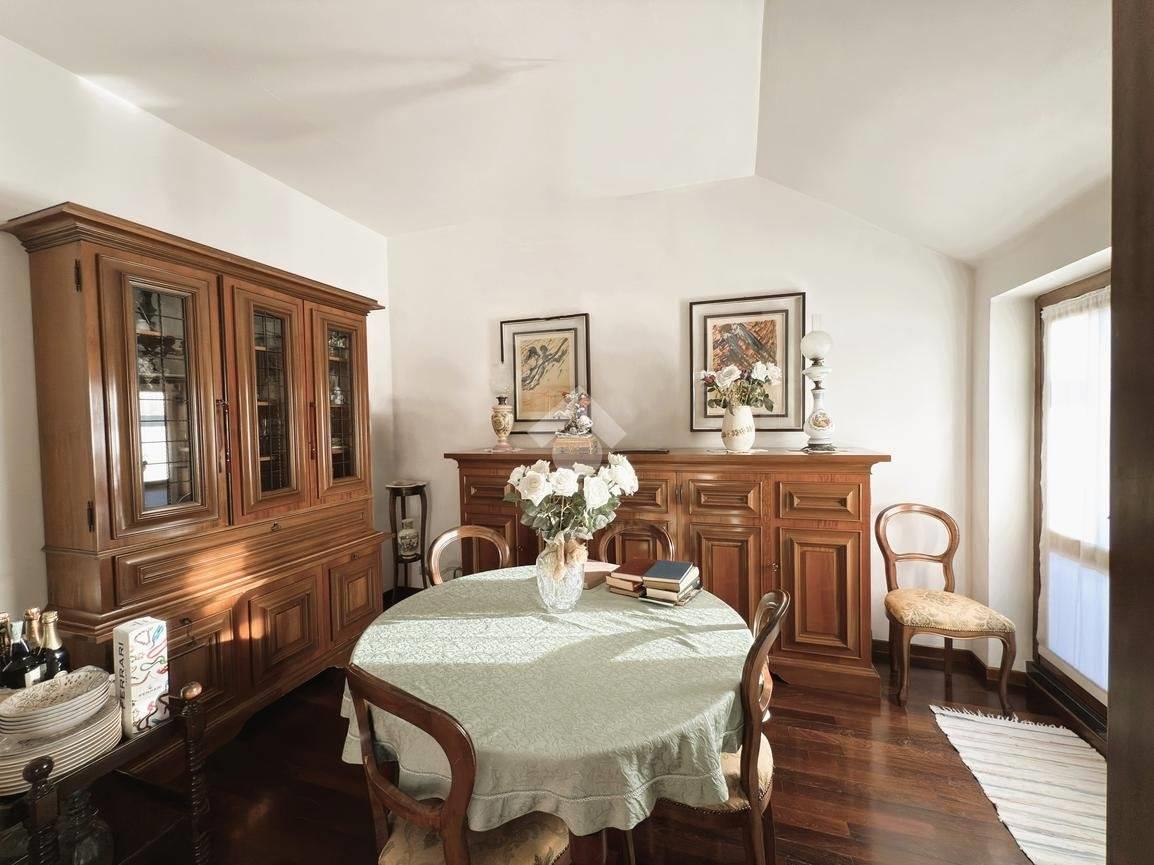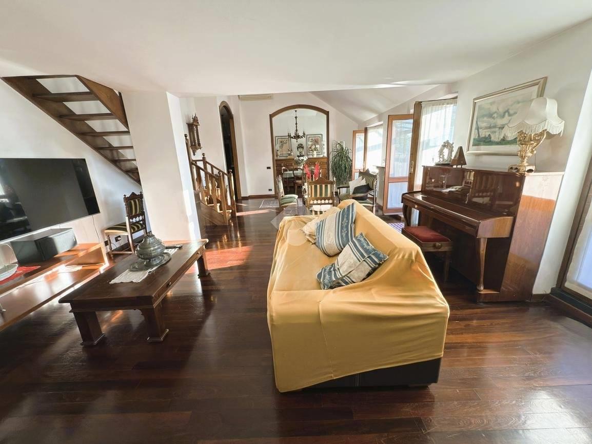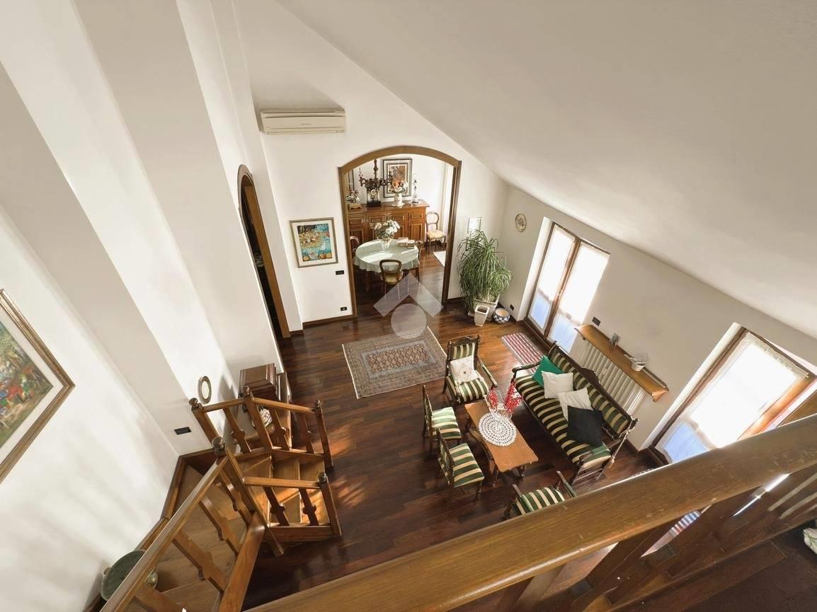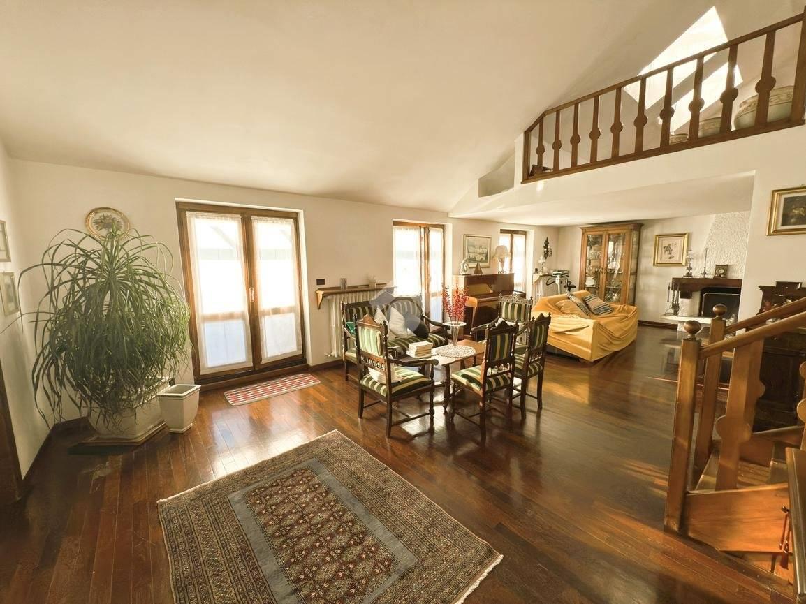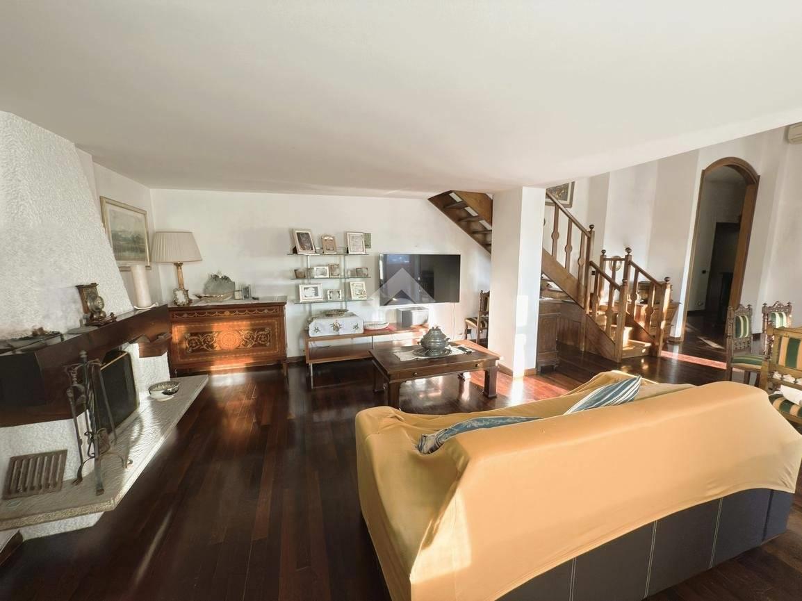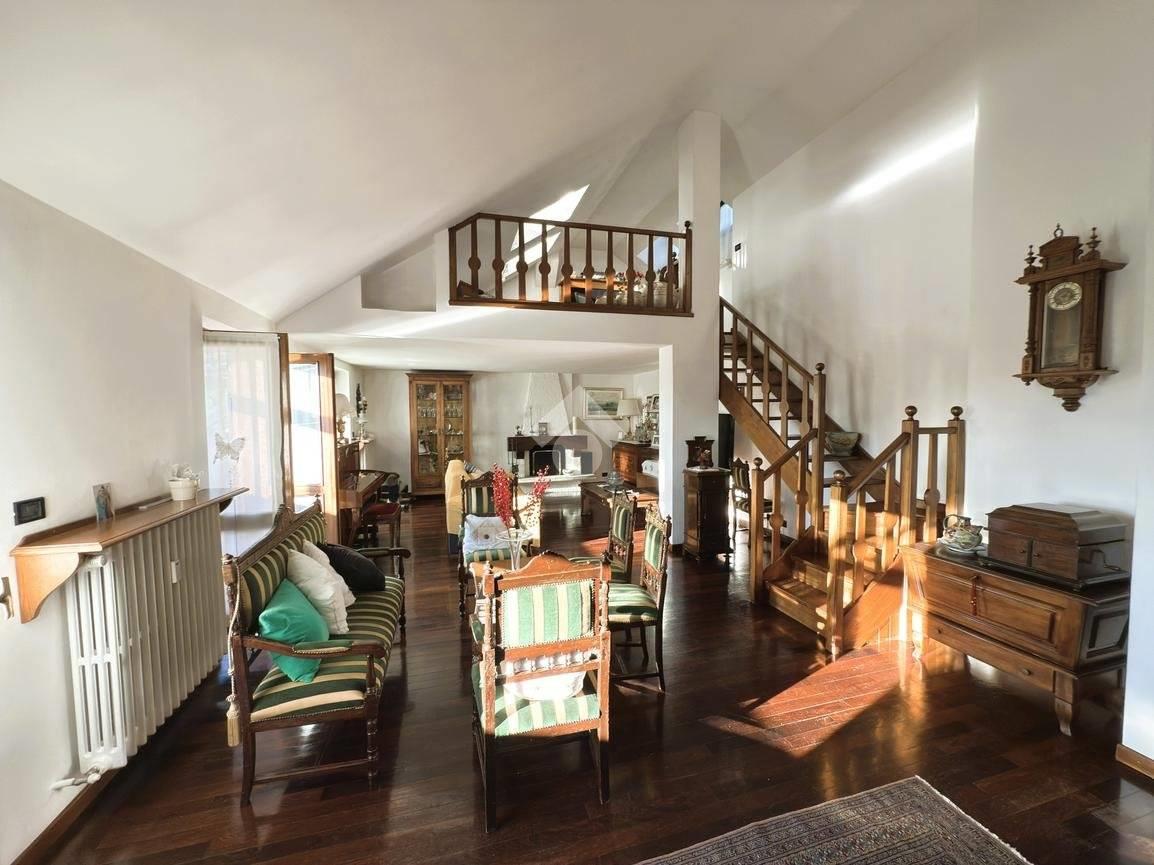 L'elegante ingresso conduce ad un salone a tutta altezza, doppio e dotatato di camino, a cui si trova annesso uno studio posto nell'alta area soppalcata; completano la zona giorno una sala da pranzo, una grande cucina abitabile ed il primo dei 3 bagni.