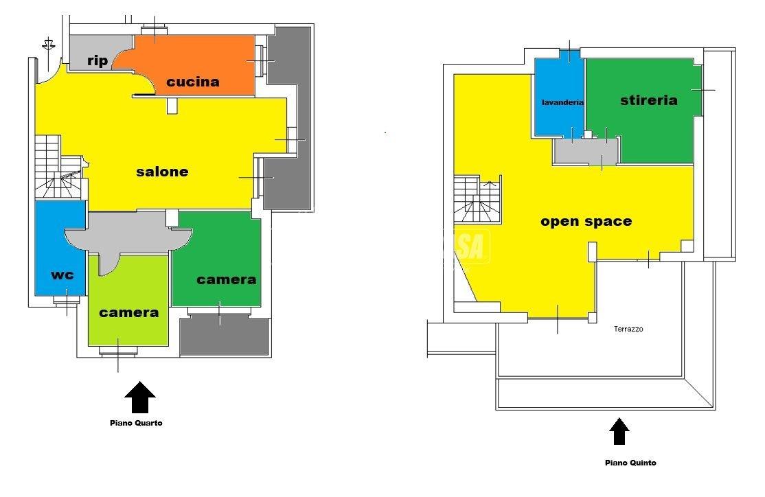 Una comoda scala interna conduce al quinto piano, dove si apre un meraviglioso locale open-space con una splendida vetrata panoramica affacciata su un terrazzo (APPENA RISTRUTTURATO) riservato e soleggiato, perfetto per godersi momenti di tranquillità. A questo livello troviamo anche un secondo bagno finestrato e un locale attualmente adibito a stireria, facilmente trasformabile in una terza camera o studio.