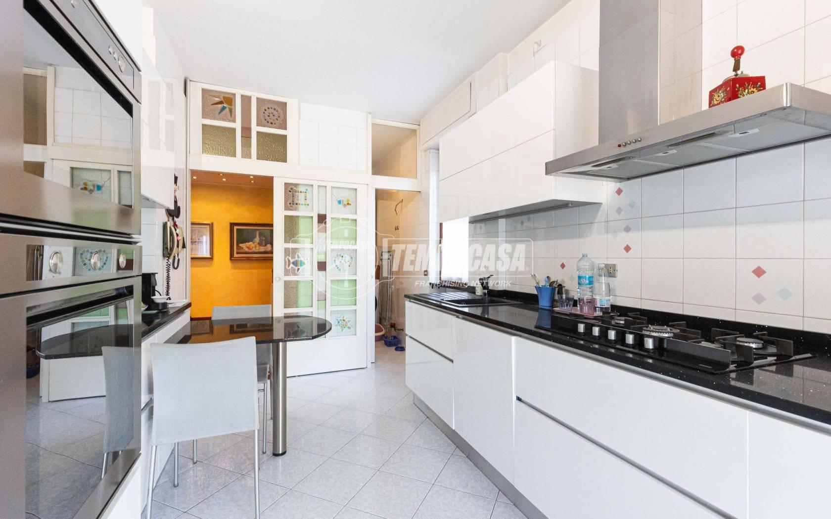 Al quarto piano, l’ingresso si apre su un grande salone elegantemente suddiviso in zona living e zona pranzo, perfetto per accogliere ospiti o rilassarsi in famiglia. La cucina abitabile, ampia e ben organizzata, è collegata insieme al soggiorno da una comoda balconata, ideale per pranzi all'aperto o per godersi momenti di relax. Completano il piano due spaziose camere da letto, un bagno finestrato, e un ripostiglio con la possibilità di realizzare un secondo servizio.