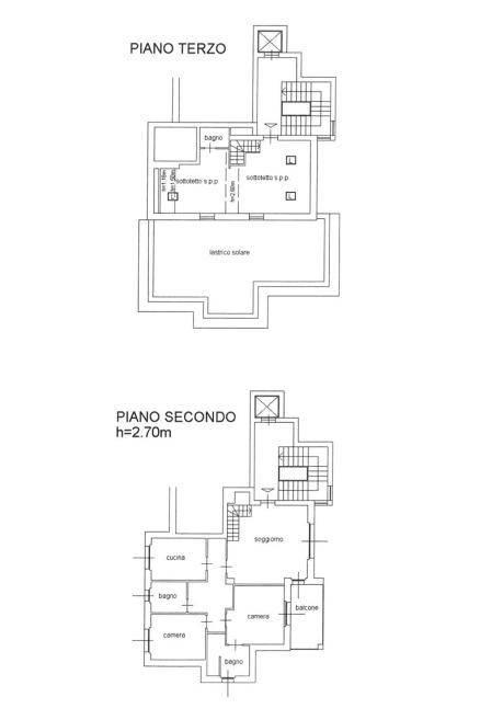 1° livello di 100 mq – Piano secondo : Ingresso nel soggiorno con terrazzino di 10 mq, disimpegno, tre camere e doppi servizi finestrati (originariamente una camera era la cucina abitabile).