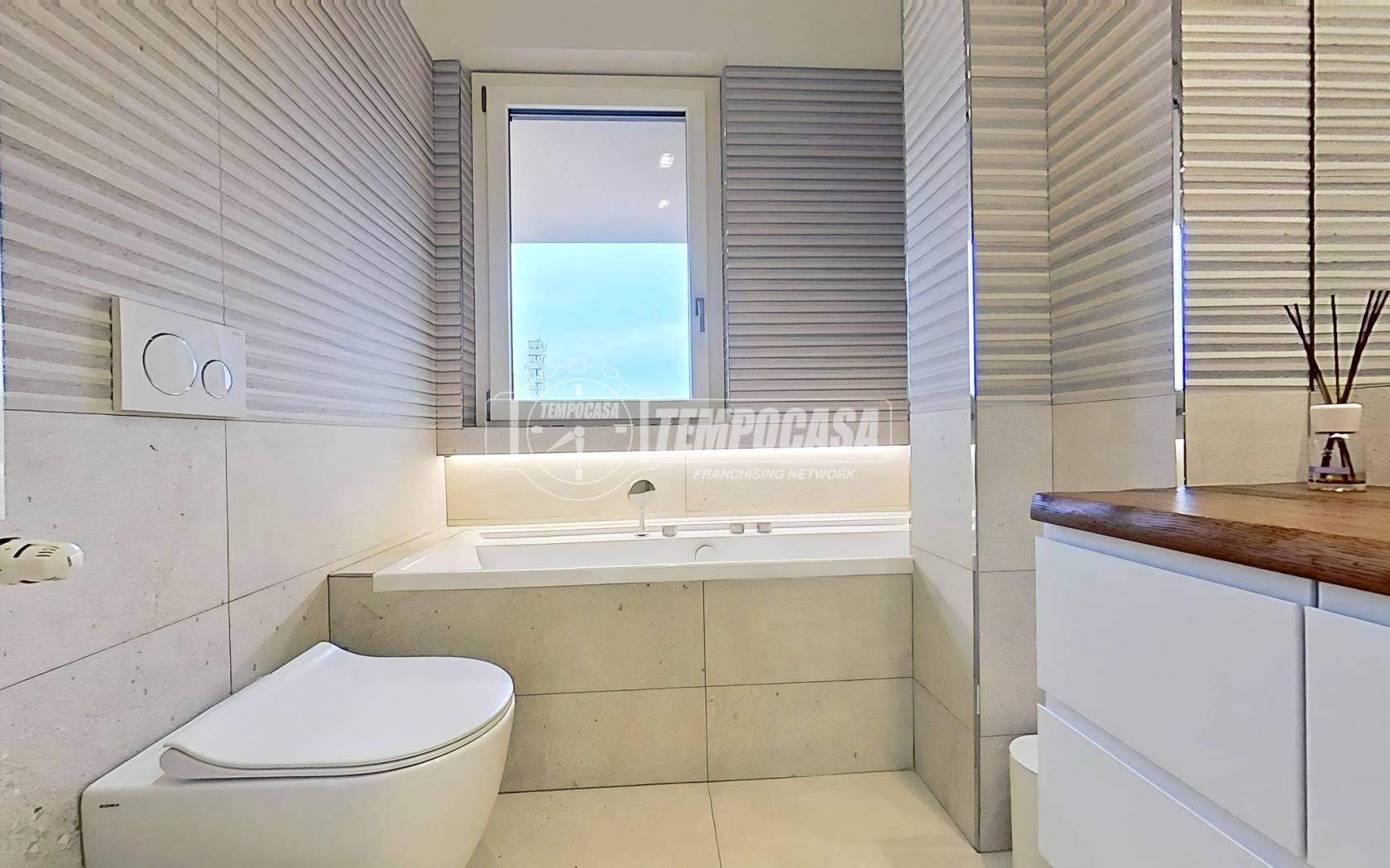 Sul primo livello trovano spazio anche un bagno con vasca idromassaggio, rifinito interamente in ceramiche Porcelanosa fuori misura e pensato per offrire un vero angolo benessere all’interno della casa, e una comoda comoda camera matrimoniale, elegante e accogliente, ideale come terza camera o per ospiti temporanei.