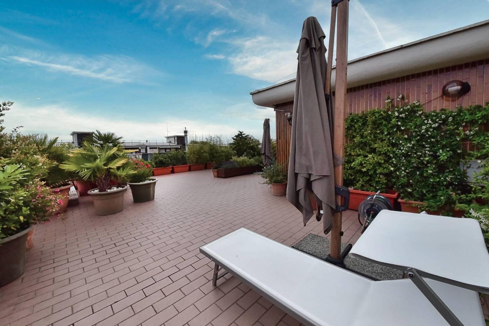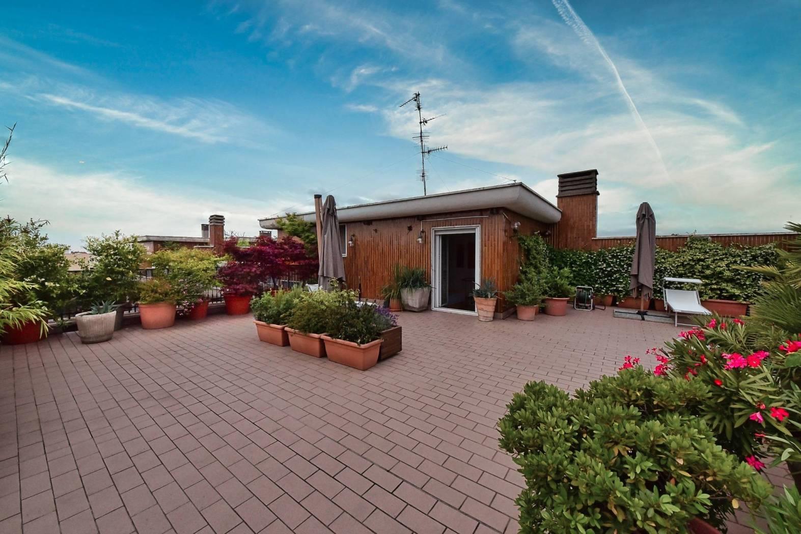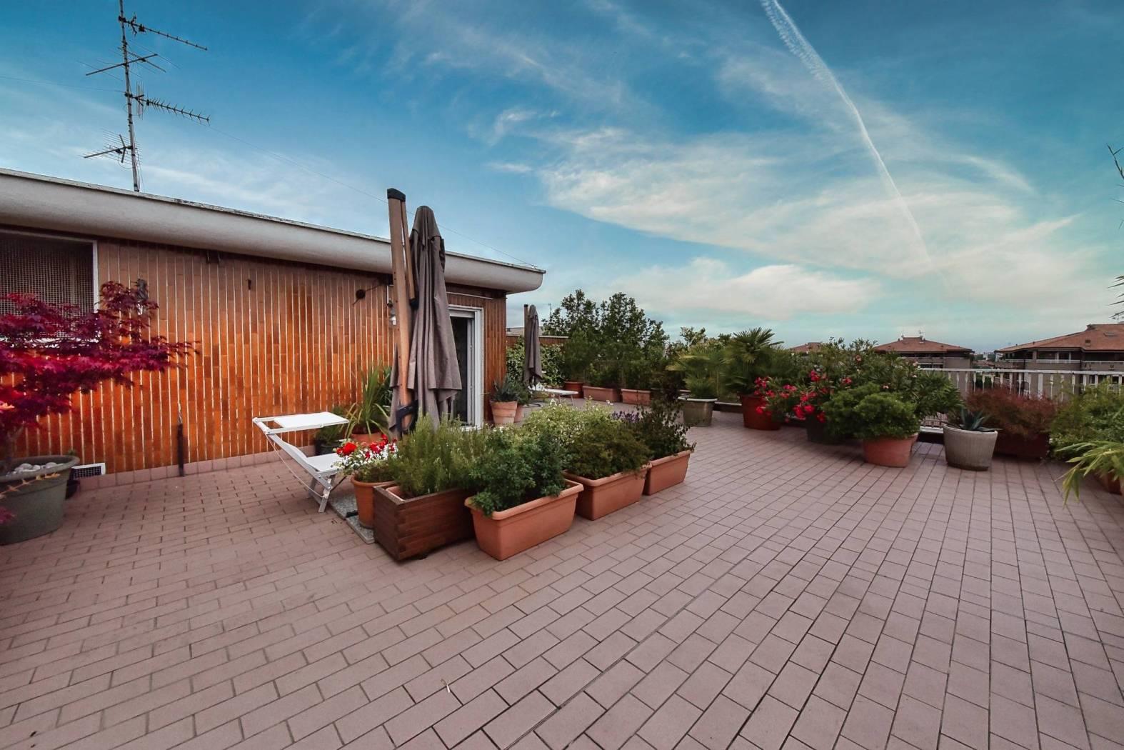 Tramite una scala a chiocciola saliamo al settimo piano dove è presente una terza cameretta e la terrazza di circa 100 mq, libera su quattro lati, ideale per trascorrere piacevoli momenti all’aria aperta.
