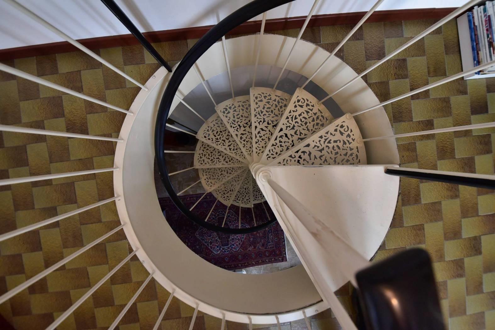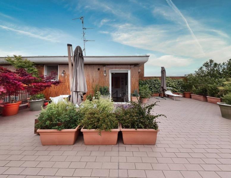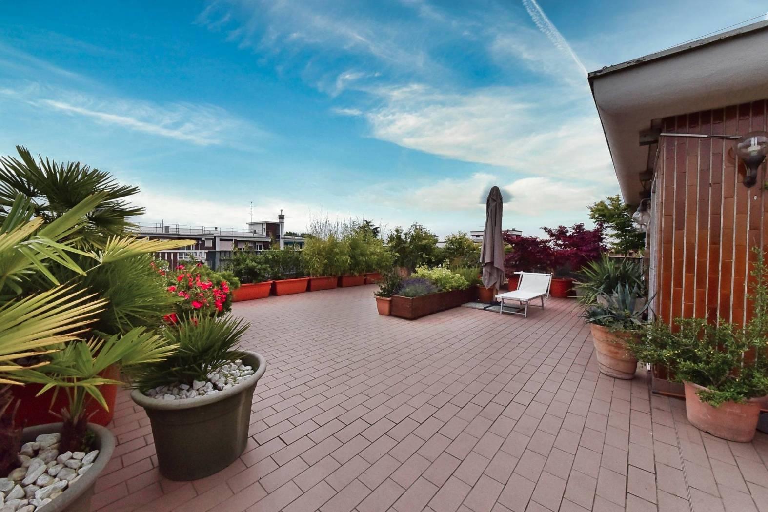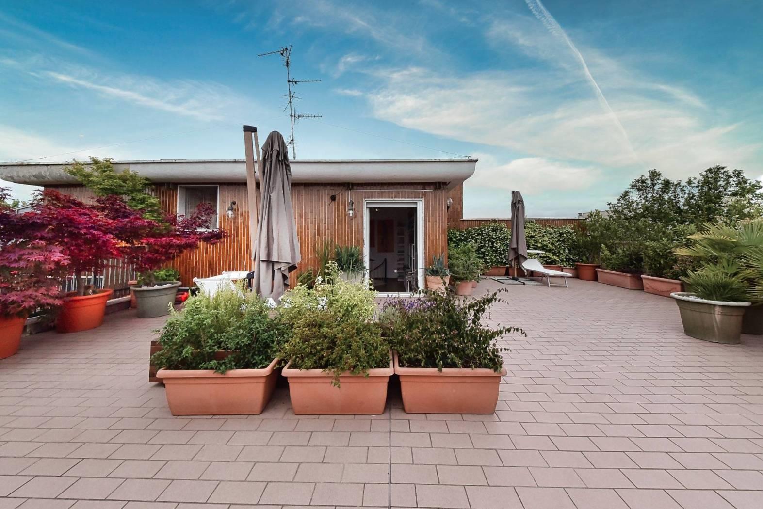 Tramite una scala a chiocciola saliamo al settimo piano dove è presente una terza cameretta e la terrazza di circa 100 mq, libera su quattro lati, ideale per trascorrere piacevoli momenti all’aria aperta.