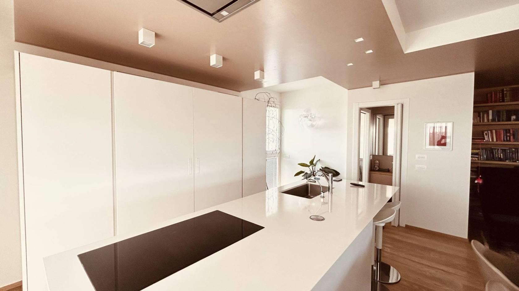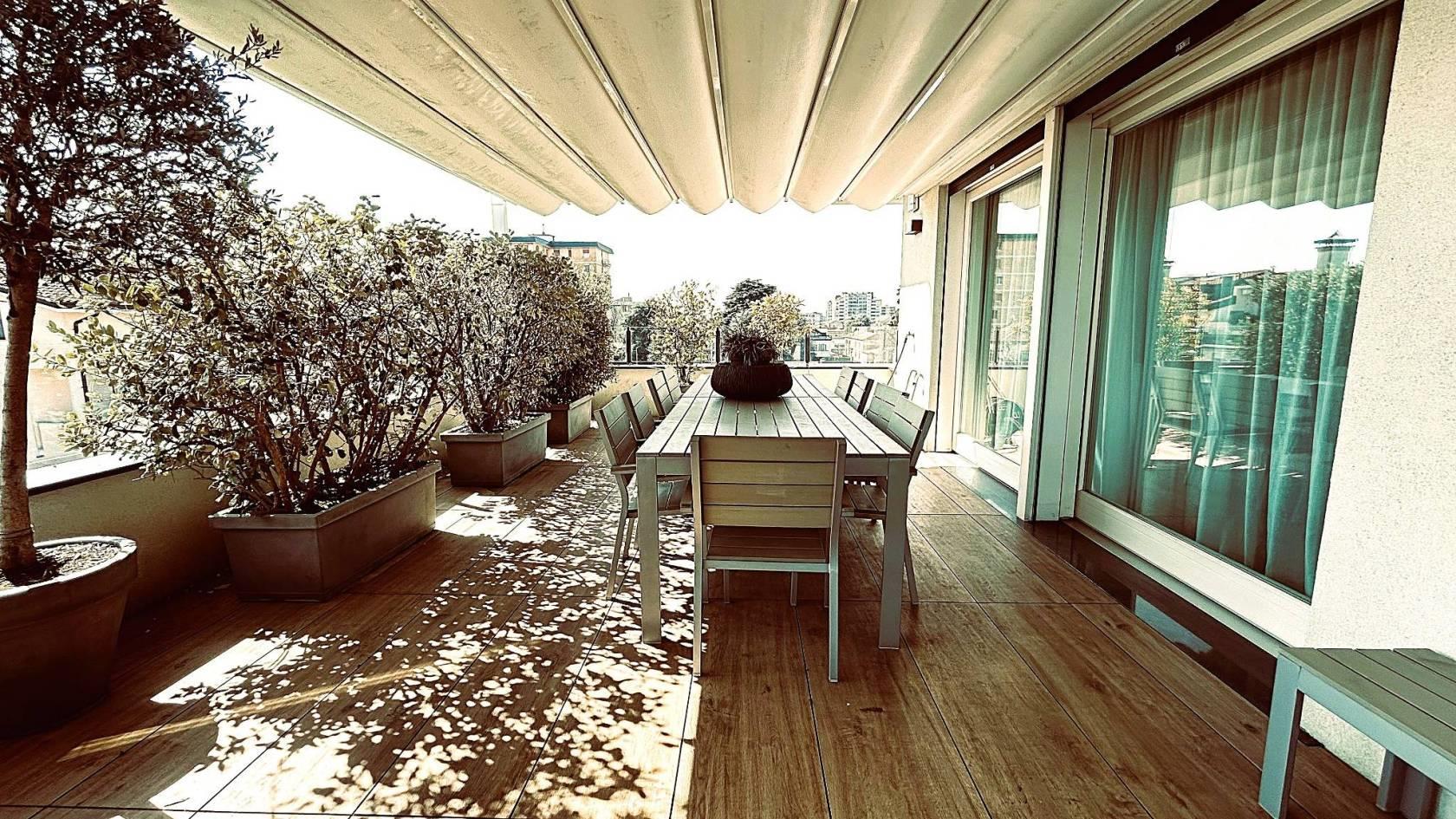 L’immobile si sviluppa al quarto piano con una spaziosa zona open space composta da cucina a vista con isola centrale, area living con zona TV, piccolo studio e bagno di servizio. Da questo ambiente si accede a un ampio terrazzo, ideale per momenti di relax e pranzi all’aperto, dotato di copertura veranda elettrificata.