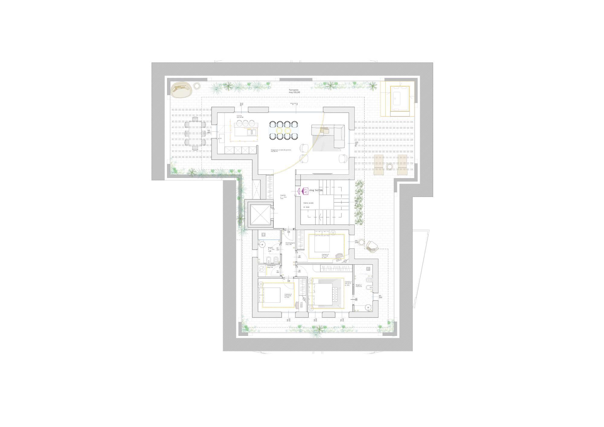 L’attico occupa l’intero ultimo piano, raggiungibile sia dalla scala comune sia dall’ascensore, che privatamente fermerà all’interno dell’appartamento.