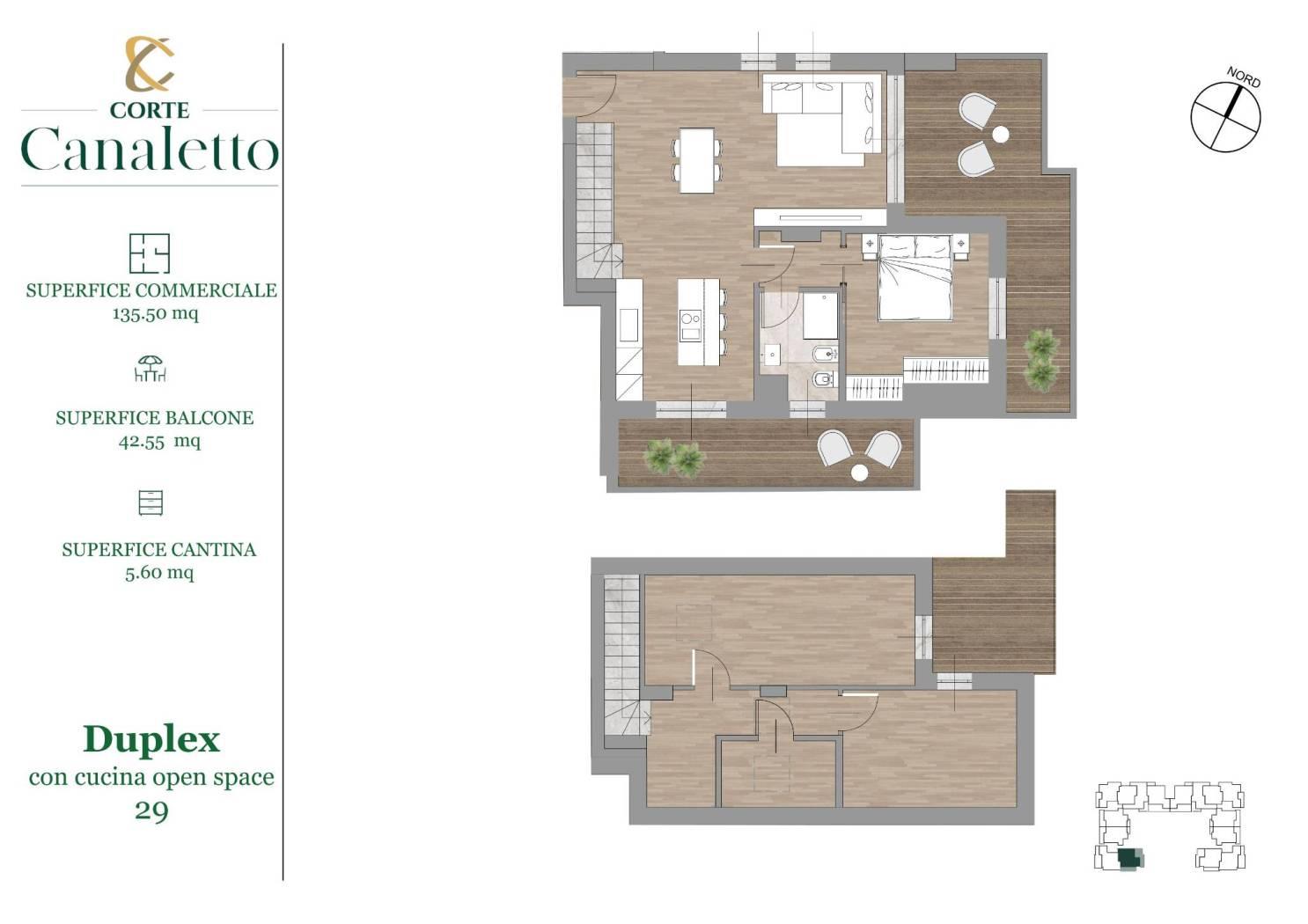 L'appartamento "29" è un trilocale al secondo piano più sottotetto di 53 mq. e terrazzi per un totale di 42 mq., ed è così composto: luminoso soggiorno con cucina open space e affaccio sul terrazzo, una camera da letto e servizio. Al piano superiore abbiamo un sottotetto con due locali, la lavanderia e un ulteriore terrazzino. Completa la proprietà la cantina al piano interrato. Possibilità di box singoli o doppi.