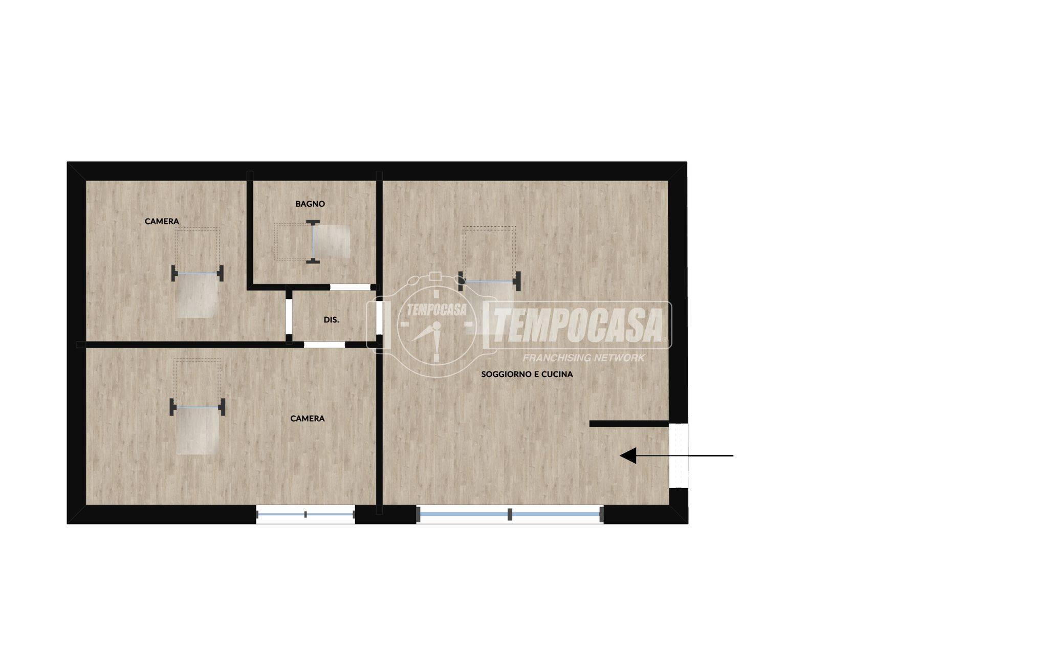 La soluzione si presenta in buone condizioni generali, con qualche intervento di ristrutturazione e ammodernamento da considerare. L’ingresso conduce direttamente in un soggiorno accogliente con cucina a vista, ambiente ideale per vivere la quotidianità in modo semplice e funzionale. Le due camere da letto offrono spazi ben distribuiti, mentre il bagno, finestrato e dotato di lucernario, garantisce luce naturale e comfort.
