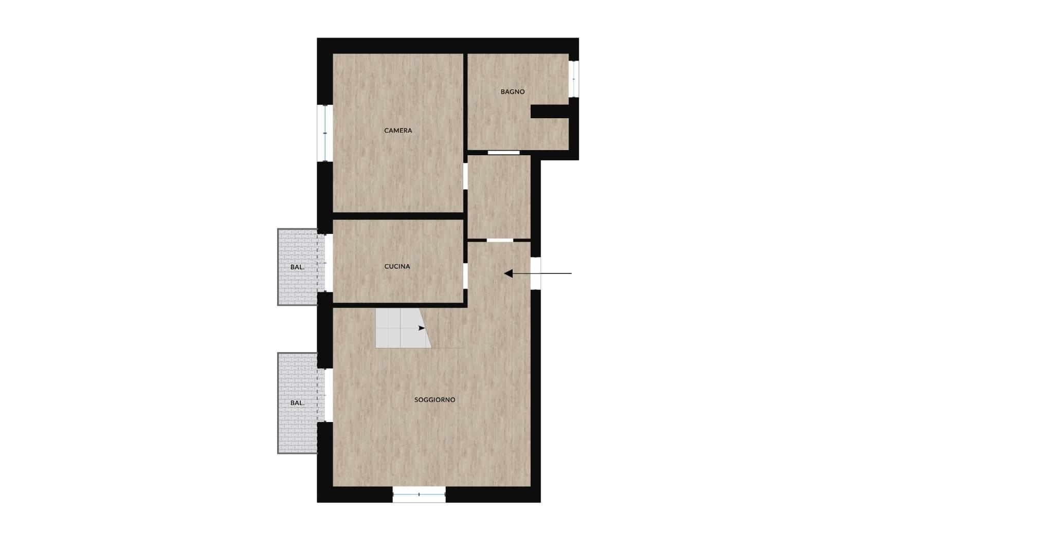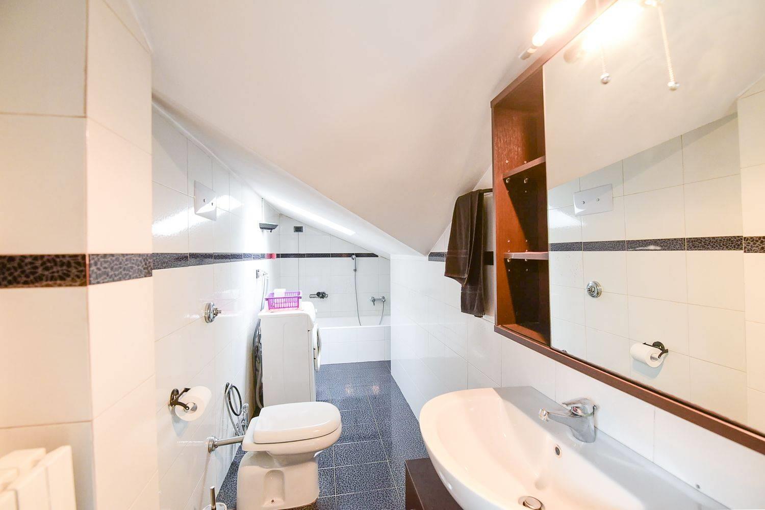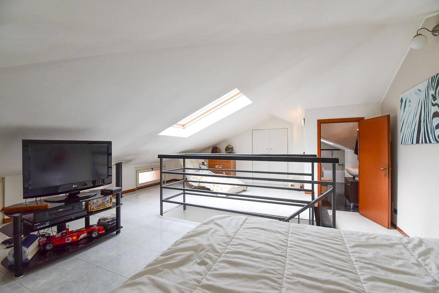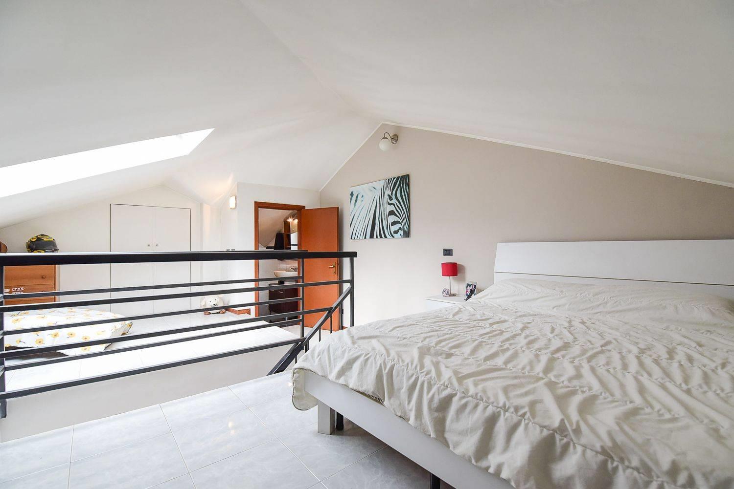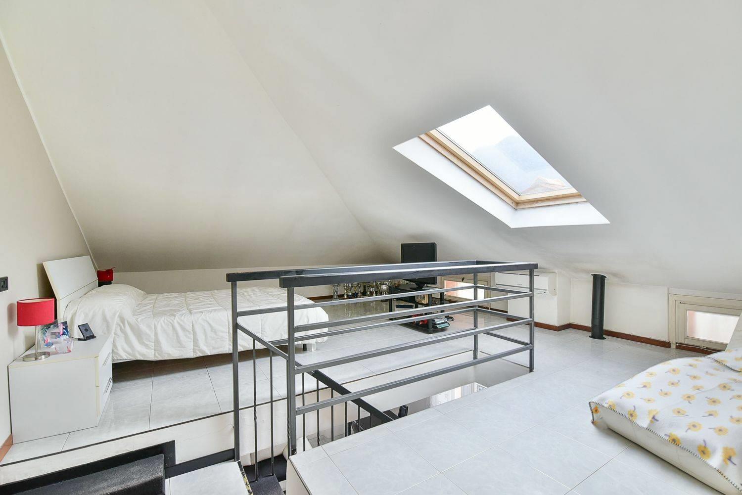 Dal soggiorno troviamo la scala che conduce al piano superiore, dove si apre un ulteriore ambiente attualmente utilizzato come camera da letto, reso luminoso dalla presenza dei velux. Su questo livello si trovano anche un bagno finestrato e spazioso e un altro locale, separato da una porta scorrevole, oggi adibito a cabina armadio.