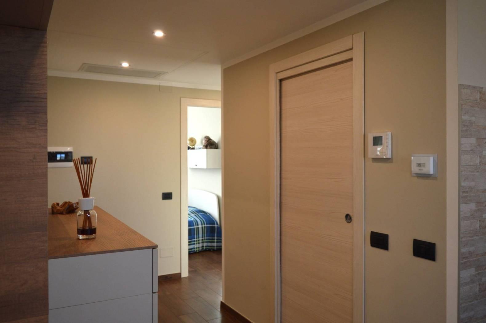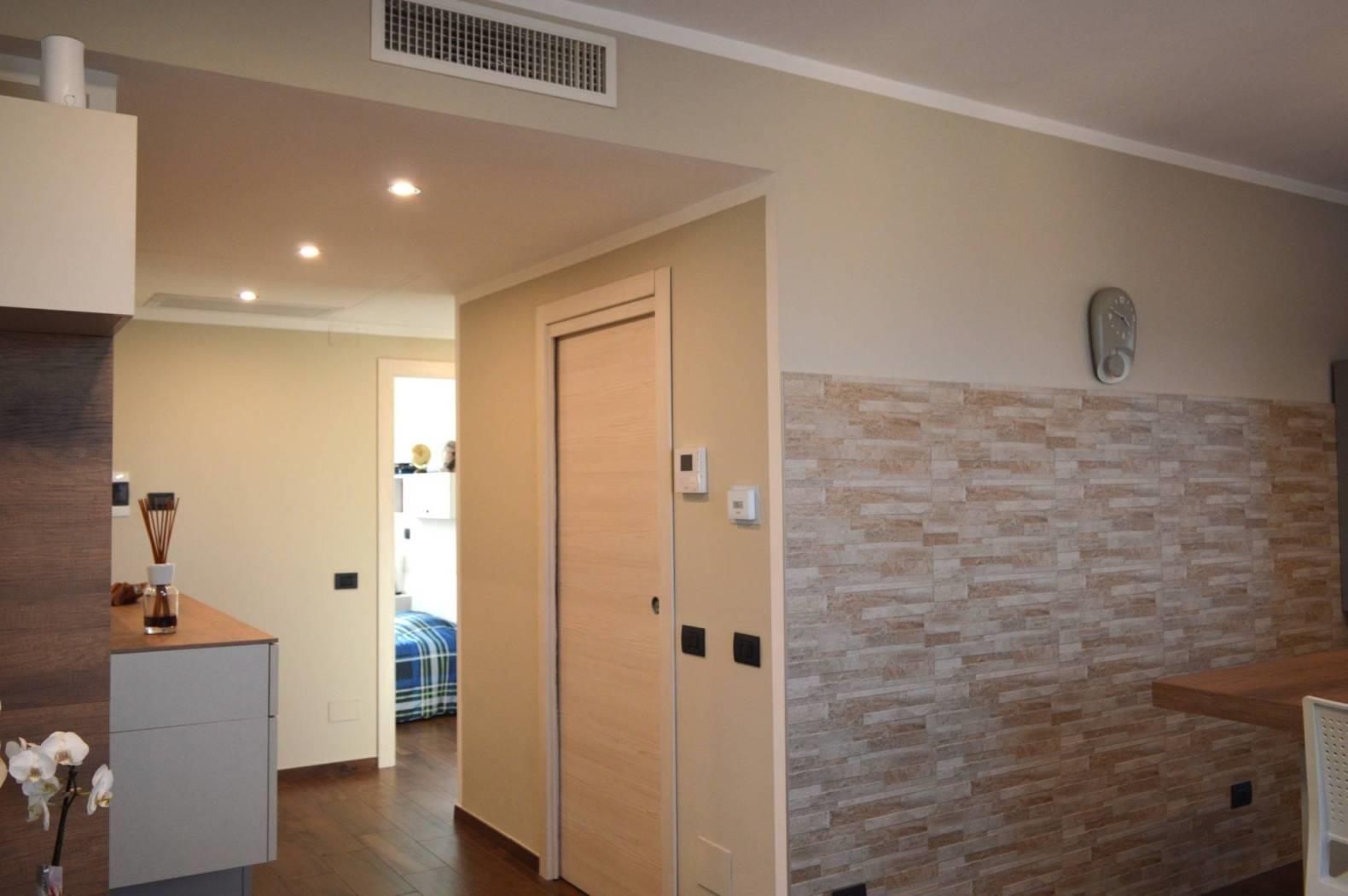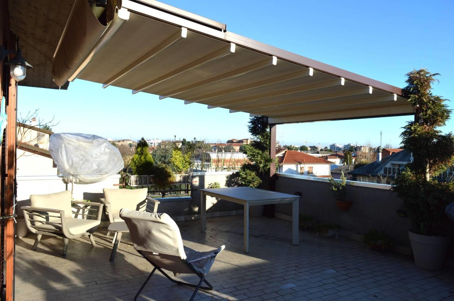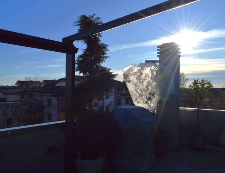 un ampio ingresso, un soggiorno con uscita sul TERRAZZO di 50 mq, una cucina abitabile a vista con uscita sul balcone, un'ampia cameretta, un bagno di servizio, una camera matrimoniale con bagno privato e con uscita sul balcone.