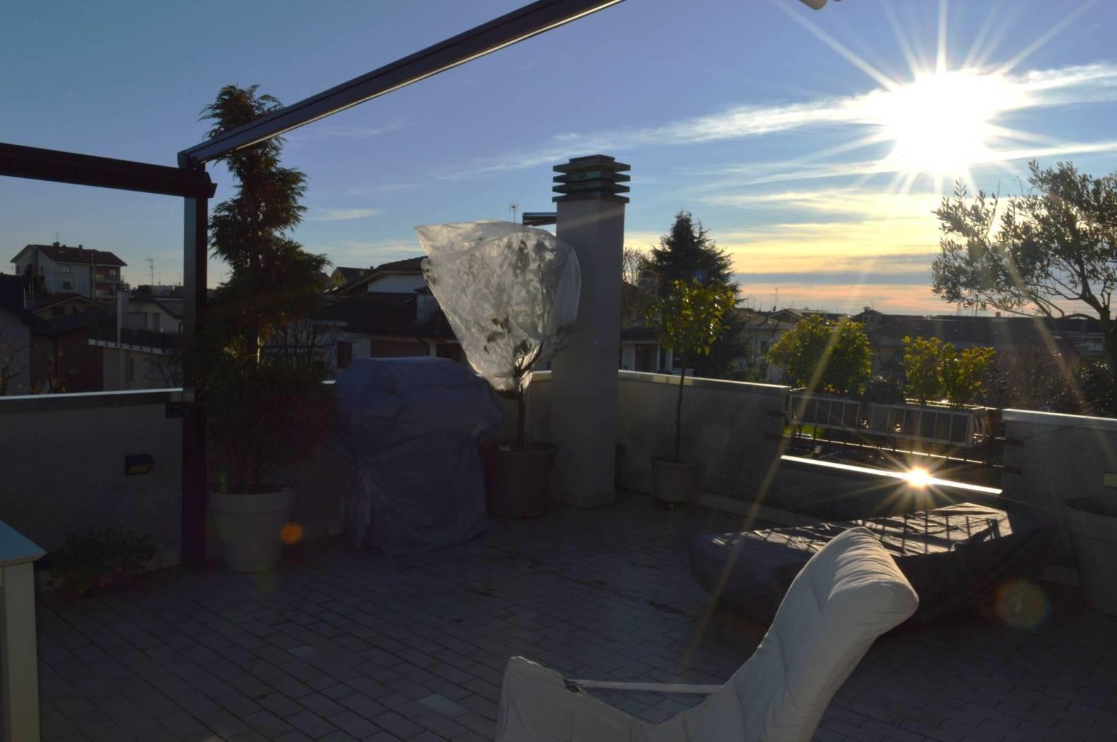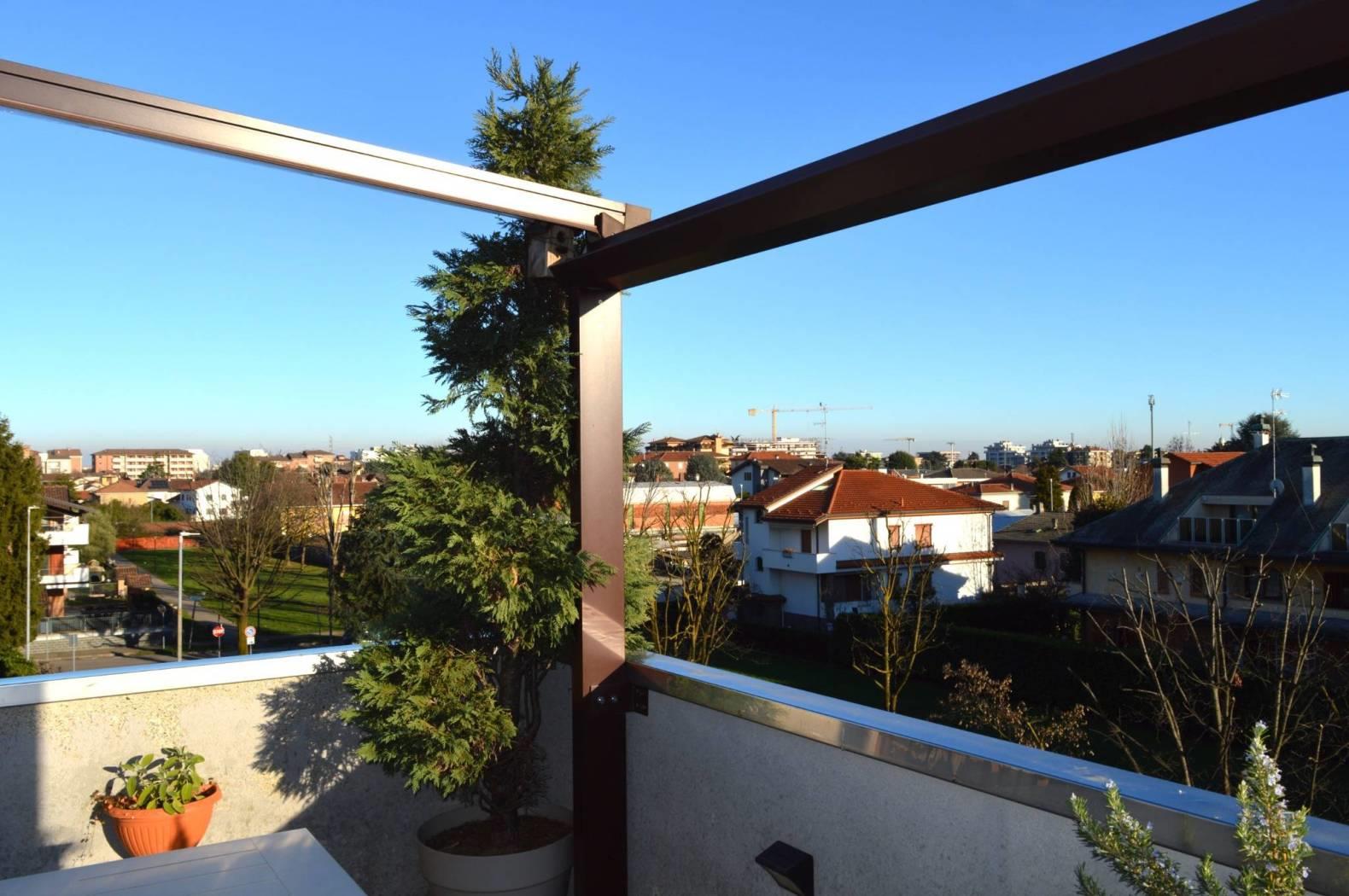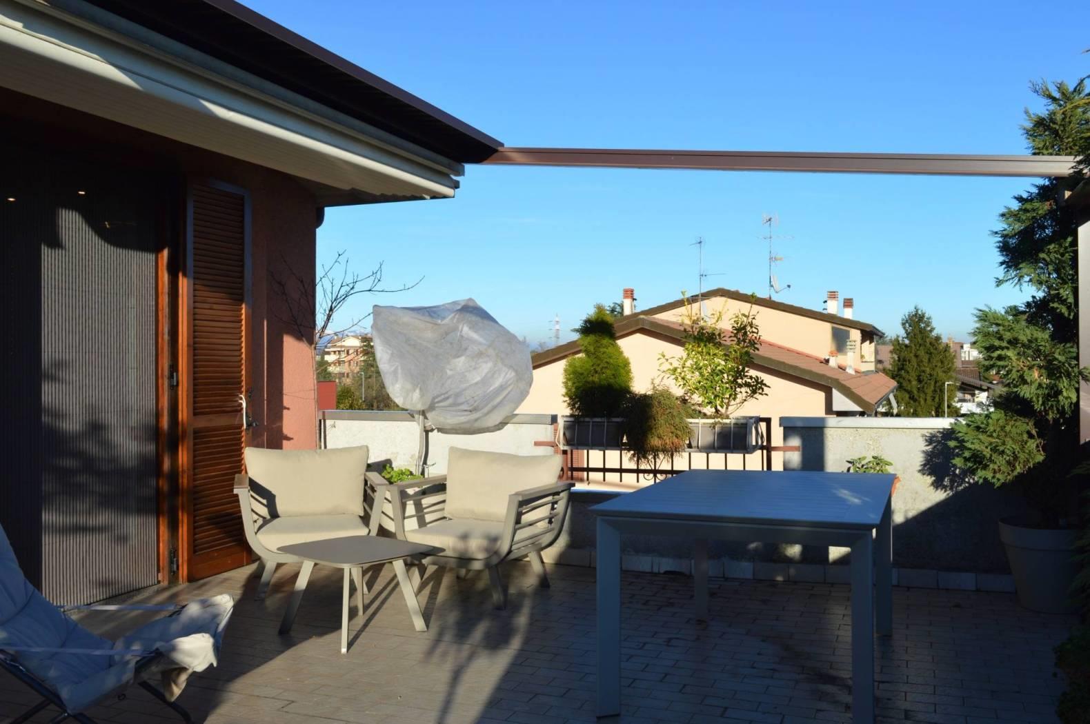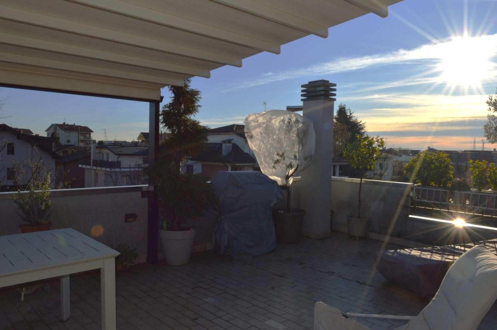 un ampio ingresso, un soggiorno con uscita sul TERRAZZO di 50 mq, una cucina abitabile a vista con uscita sul balcone, un'ampia cameretta, un bagno di servizio, una camera matrimoniale con bagno privato e con uscita sul balcone.